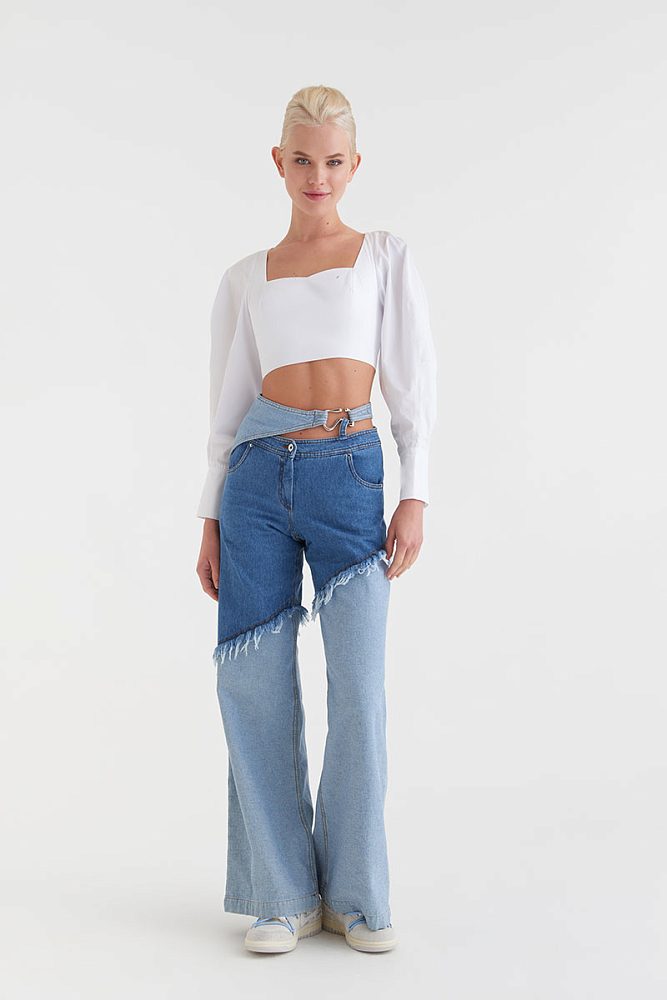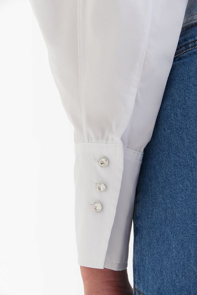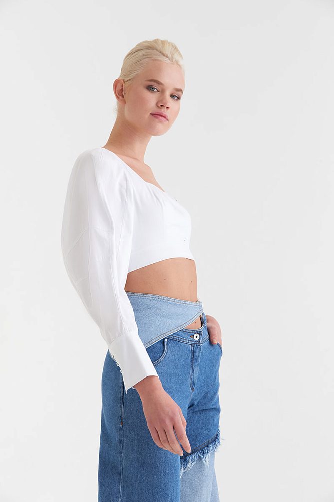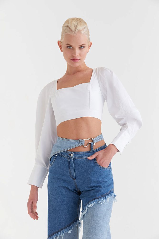 Кроп-блуза с объемными рукавами и застежкой-молнией на спине для создания утонченных образов. Графичный вырез, облегающая посадка, напоминающая корсет, пуговицы-стразы на манжетах — модель обладает ярким индивидуальным характером, но вместе с тем достаточно универсальна. Вы можете надеть хлопковую блузу как с элегантной юбкой, так и с бунтарскими джинсами.