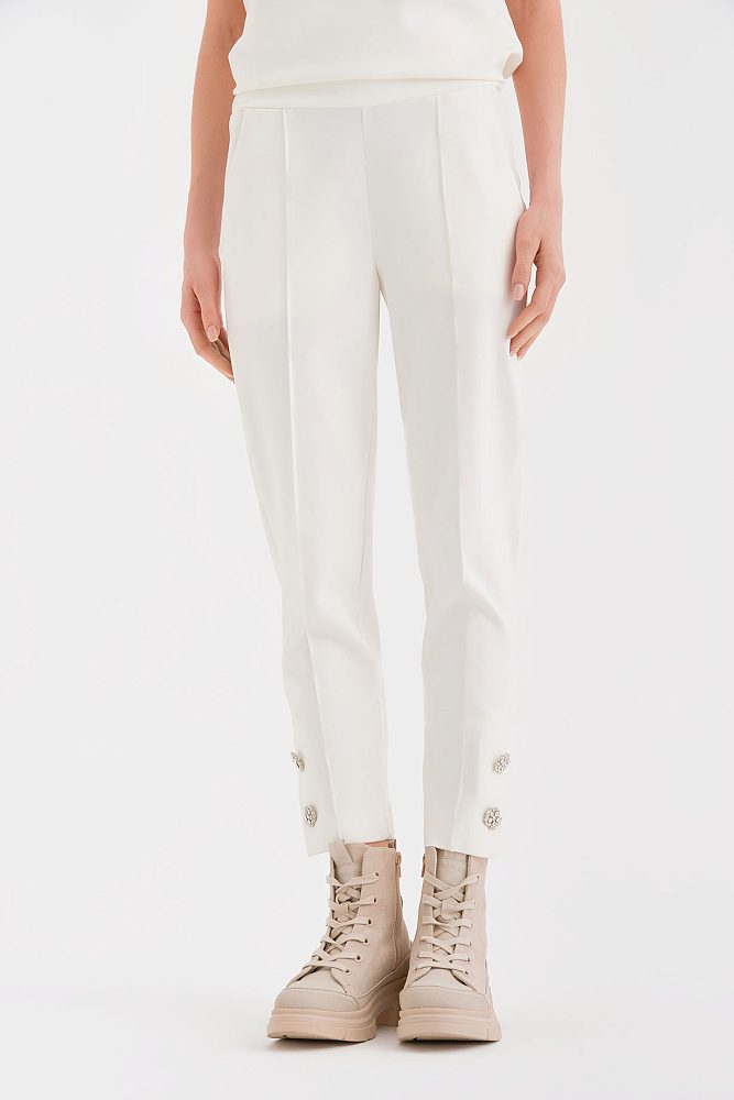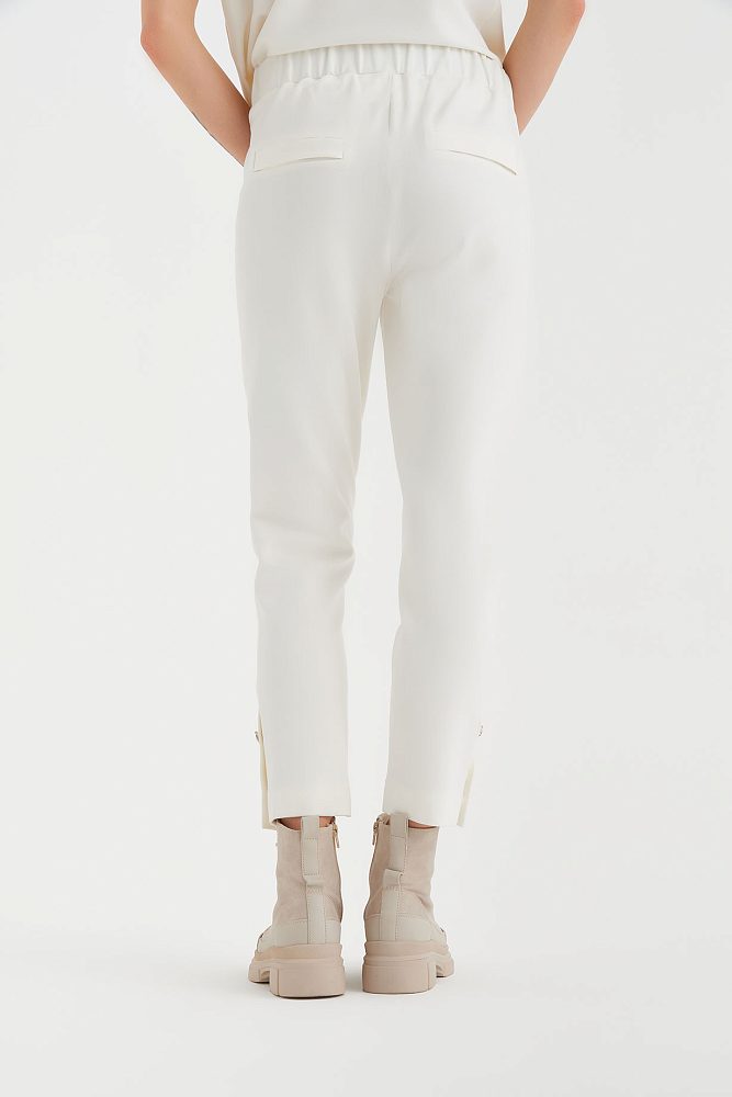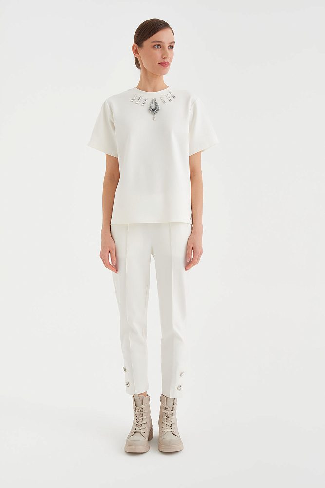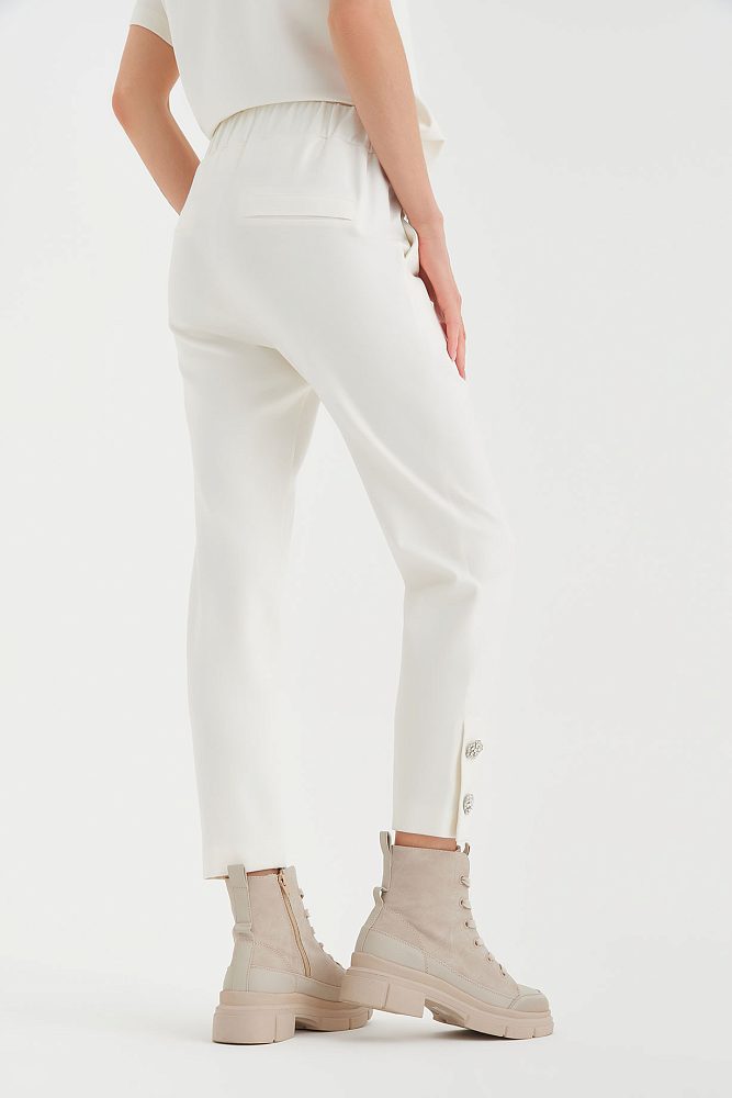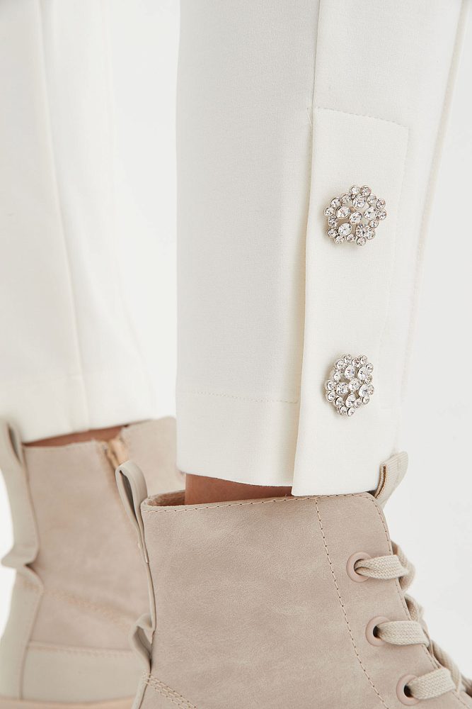 Белые брюки – мультифункциональная модель с интересными акцентами из страз.   Эту модель можно сочетать практически с любыми вещами из вашего гардероба или составить актуальный белый total look, например, с футболкой из весенней коллекции Gizia. Длина брюк ⅞ позволяет продемонстрировать стильную обувь, а зауженный крой выгодно подчеркнет вашу фигуру.