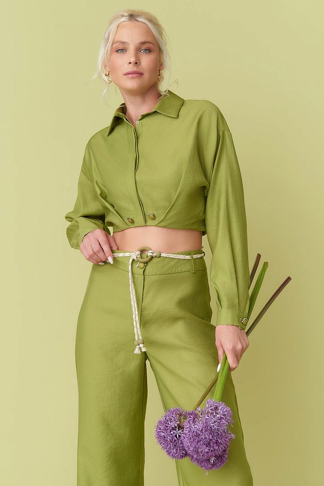Сделайте заявление с костюмом, где вытачка – это эстетика образа! Получите современный и утонченный вид. Благодаря сочному теплому цвету, длинным прямым брюкам с высокой талией, необычному ремню и укороченной рубашкой с воротником, длинным развевающимся рукавом флаттер и манжетам вы обязательно выделитесь из толпы.