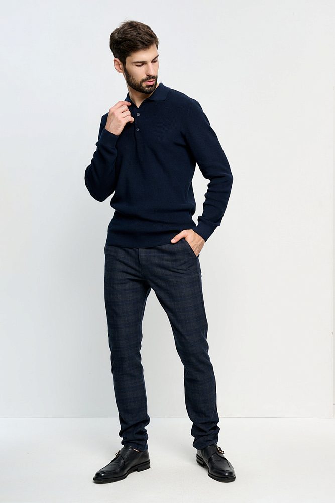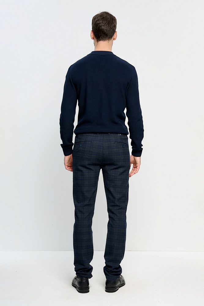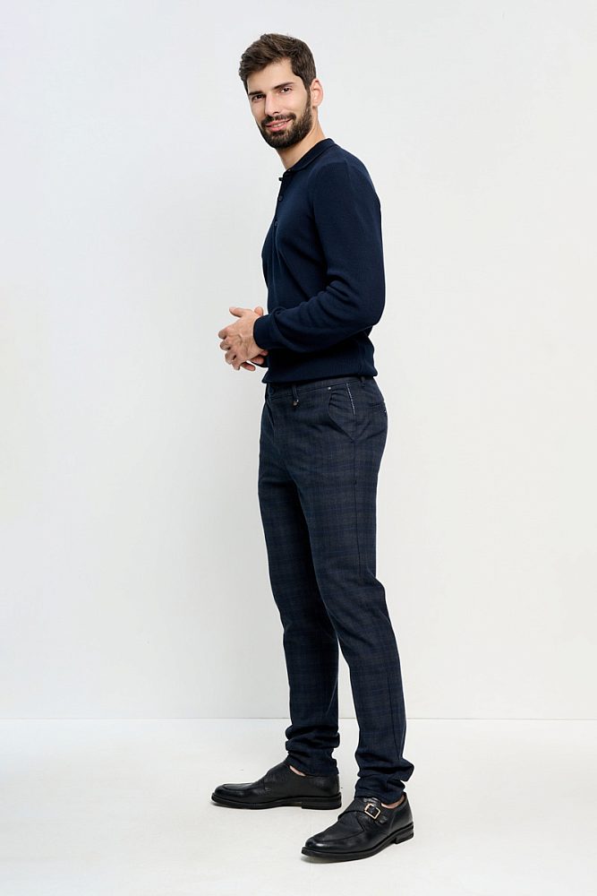 Тёмно-синие брюки в клетку для элегантного делового образа. Базовая модель спокойных оттенков делает look лёгким и в то же время светским при гармоничном сочетании с другими элементами одежды. Ткань прекрасно держит форму и сохраняет тепло, что актуально в осенне-зимний период.