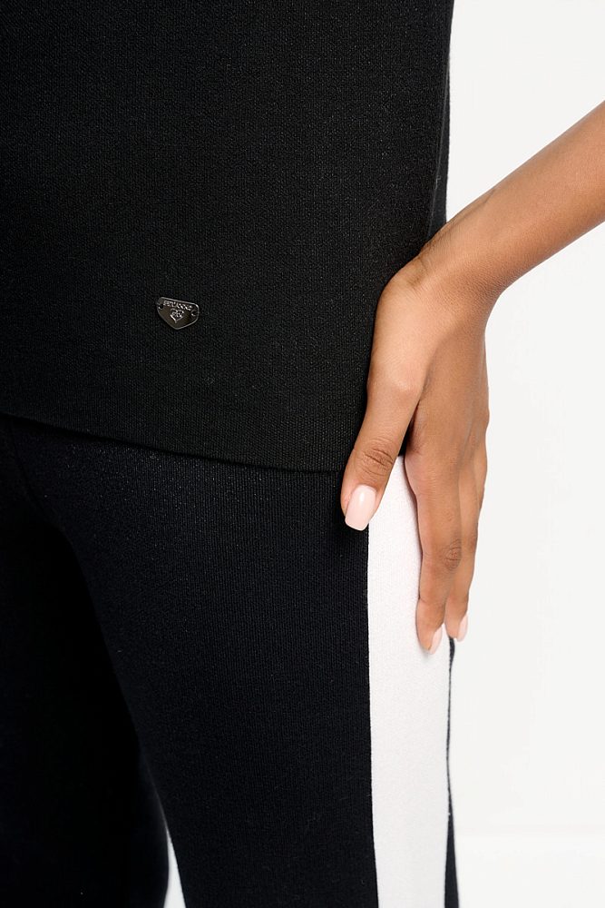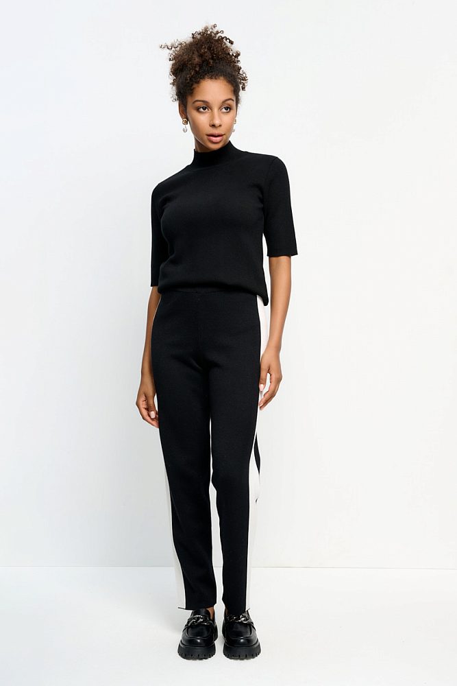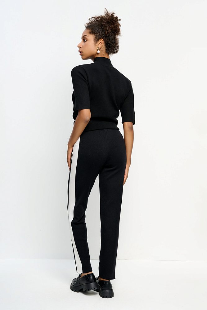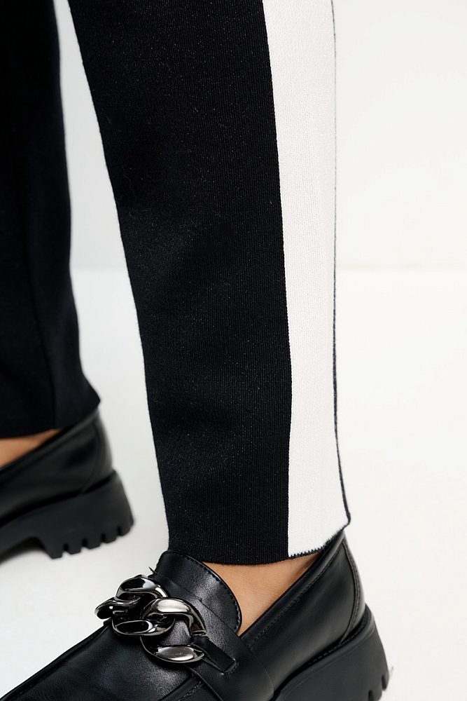 Брюки прямого кроя с широкими контрастными лампасами помогут создать трендовый образ в стиле кэжуал, спорт и спорт-шик. Модель с классической средней посадкой достаточно свободно сидит на бедрах и не стесняет движения. Комфортная дышащая ткань из хлопка и вискозы с добавлением полиэстера.