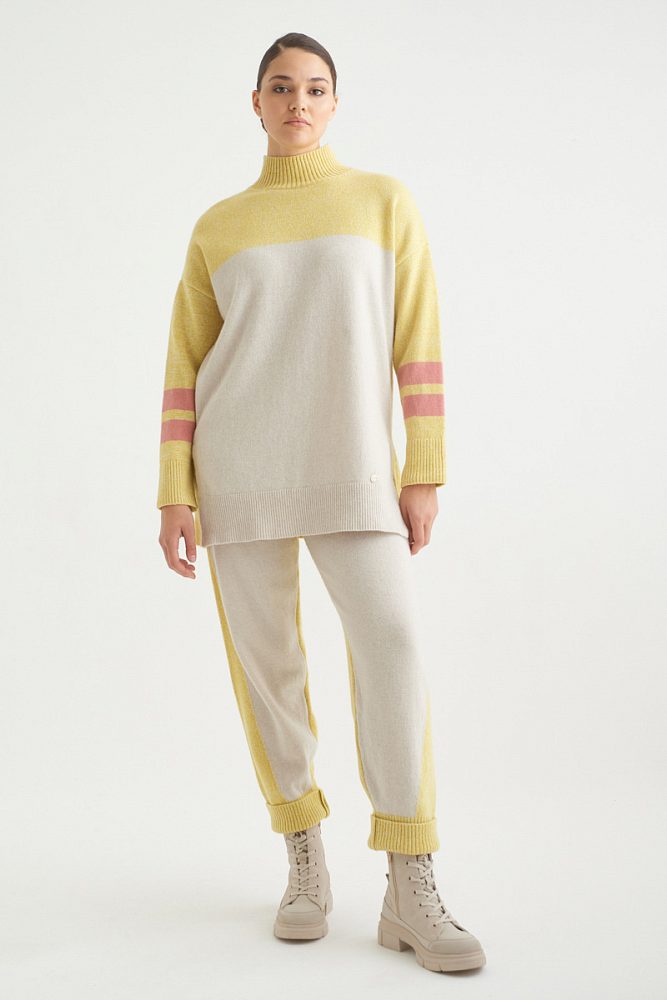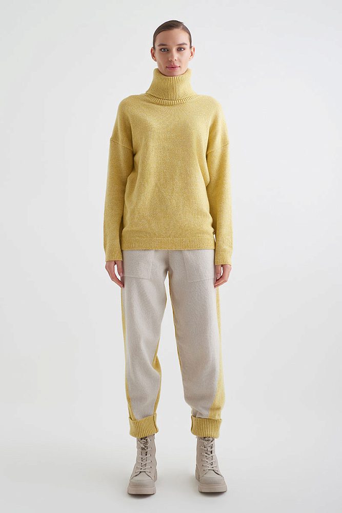 Брюки-джоггеры из шерсти мериноса и кашемира отлично согреют зимой и станут любимым элементом одежды в гардеробе смарт-кэжуал. Молочный цвет брюк добавляет нежности и уюта в образ, а широкая резинка на талии и манжетах обеспечит вам комфорт. Дополнить джоггеры можно худи, водолазкой, свитером крупной вязки.
