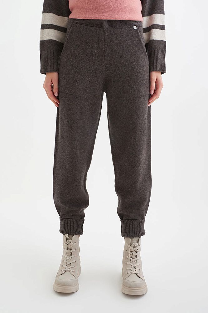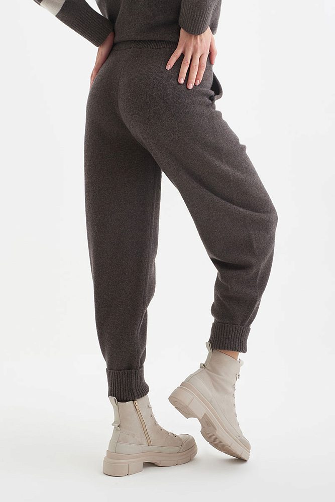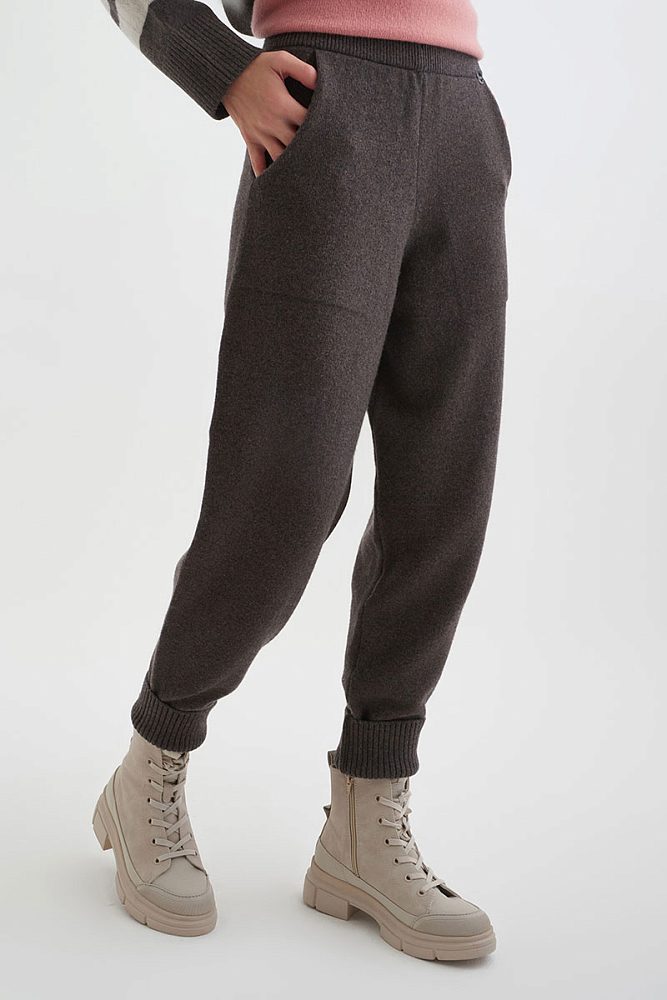 Теплые джоггеры из шерсти мериноса коричнево-серого цвета легко впишутся в повседневный зимний гардероб. Пояс-резинка, глубокие карманы и высокая посадка для современных и удобных образов в стиле смарт-кэжуал и спорт.