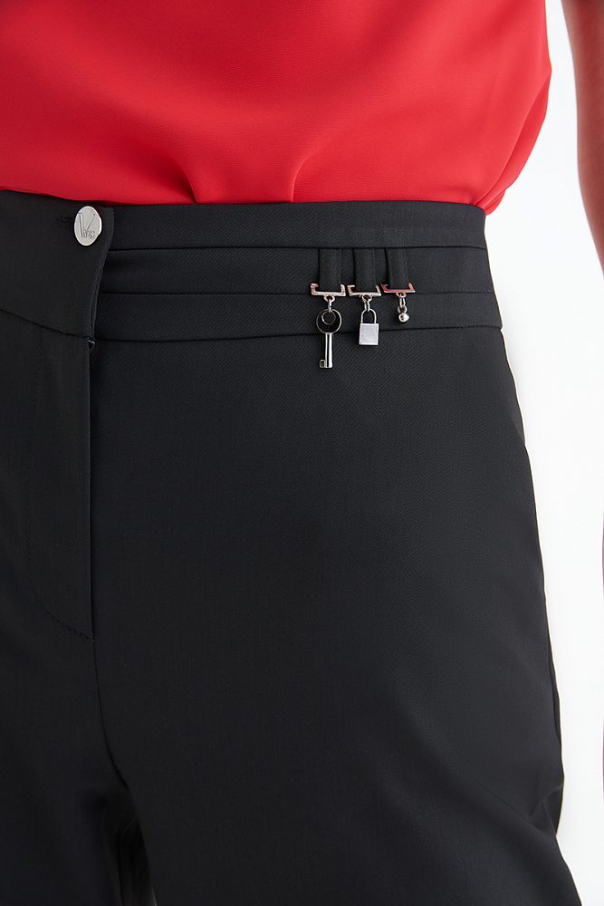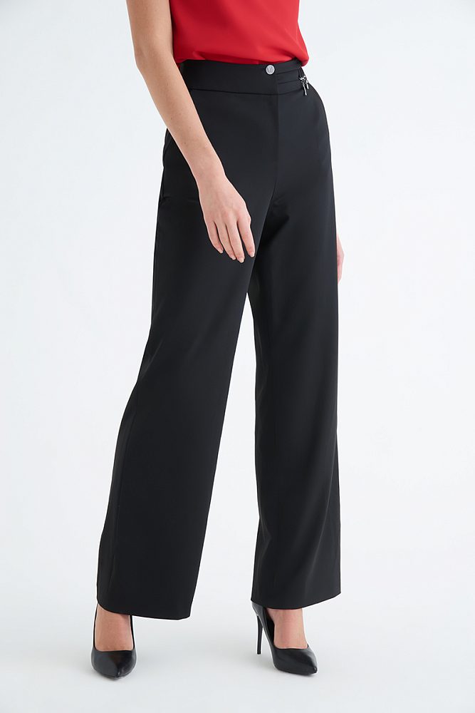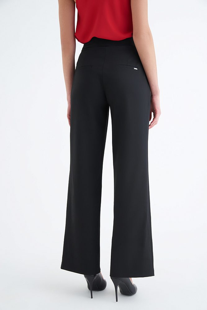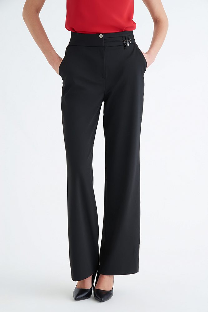 Свободные брюки прямого кроя с высокой посадкой и прорезными карманами — безупречная база для деловых аутфитов. Дизайнеры учли желание каждой женщины носить запоминающиеся образы и добавили на пояс игривые детали.
