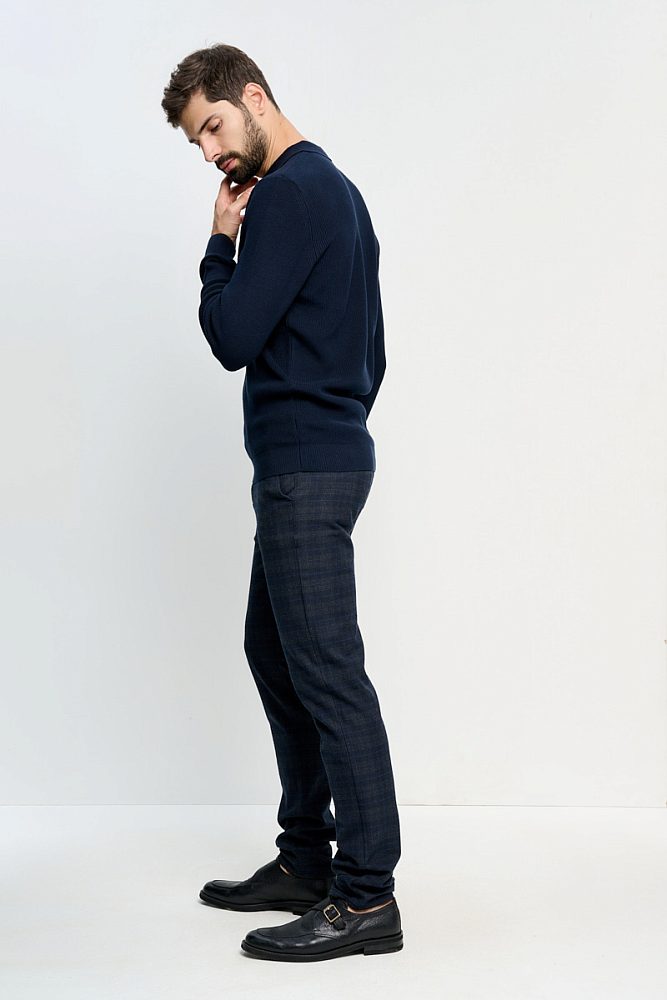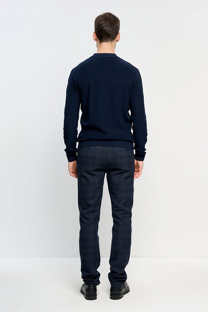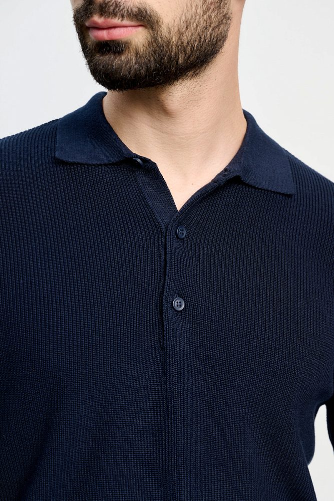 Поло с длинным рукавом — незаменимая вещь мужского гардероба. Лёгкий свитер тёмно-синего цвета позволяет составить множество комбинаций с пиджаками и кардиганами. Также свитер будет прекрасно смотреться соло в образе смарт-кэжуал.