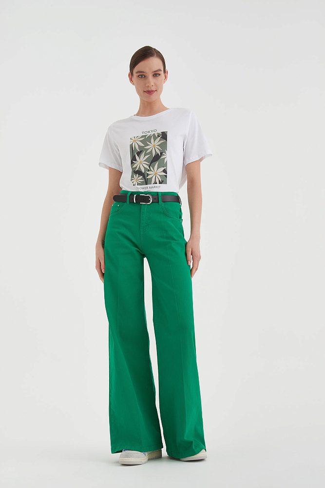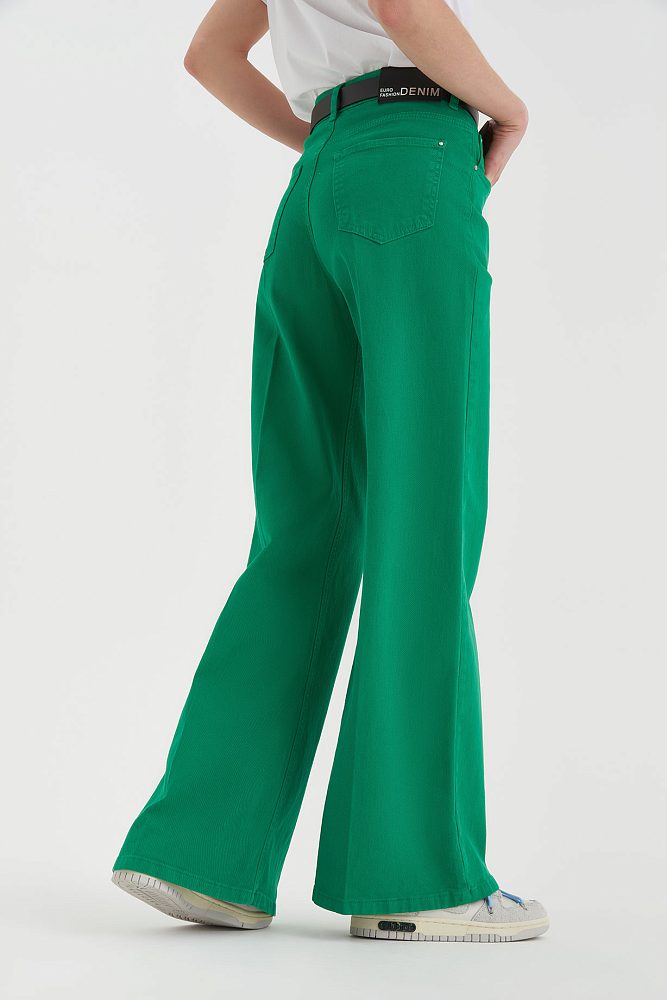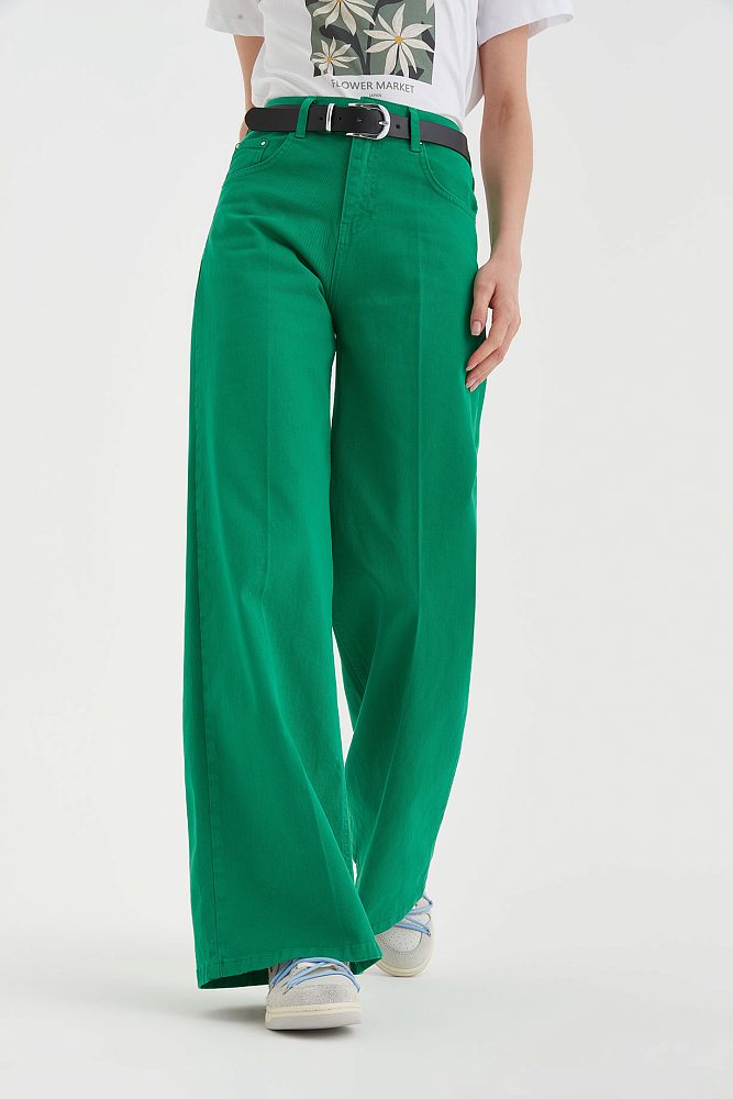 Зеленый уже несколько сезонов занимает лидирующие позиции в списке самых трендовых цветов сезона. Широкие джинсы в насыщенном оттенке сочной травы могут стильно освежить повседневный гардероб, послужить главным цветовым акцентом образа или стать частью яркого тотал лука в паре с курткой-джинсовкой в тон.