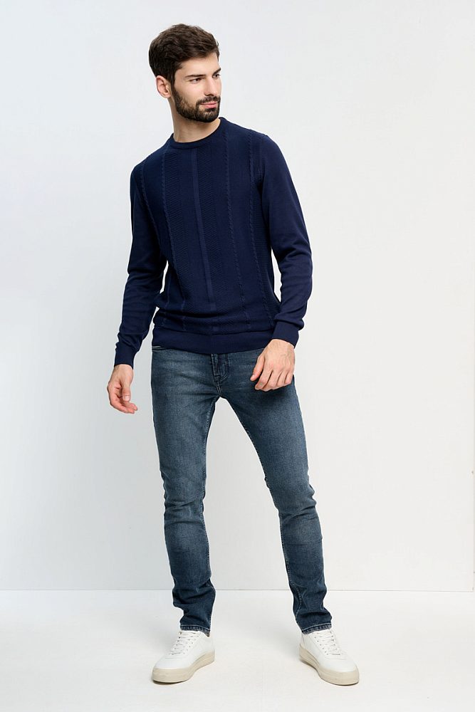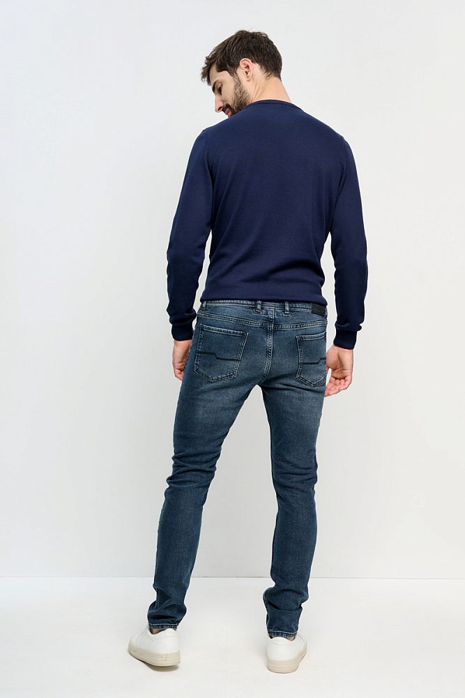 Тёмно-синие джинсы средней посадки из слегка тянущегося дышащего денима. Приятный синий оттенок с декоративными лёгкими потёртостями позволит сочетать брюки со свитшотами, худи и пуловерами любых цветов. Практичные и универсальные джинсы гармонично разбавят как офисный look, так и классический образ.