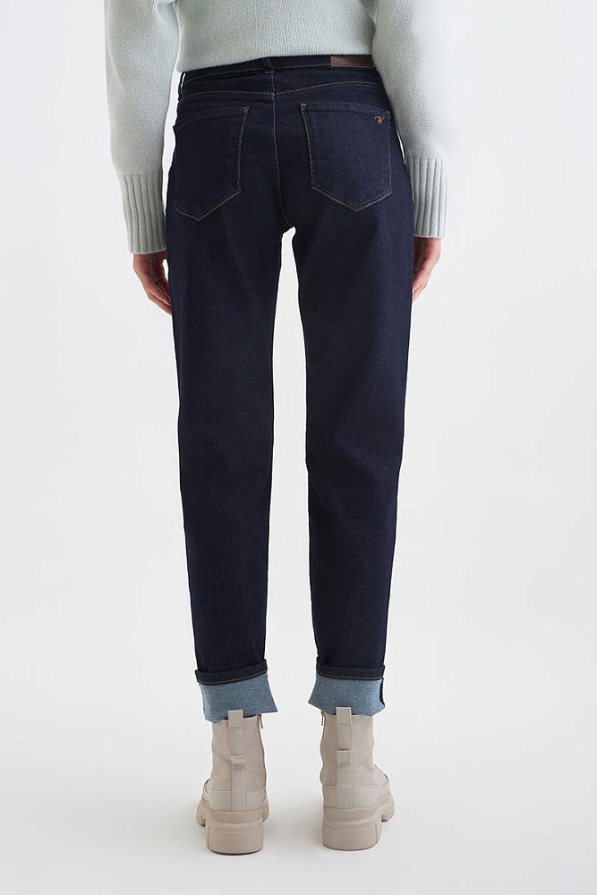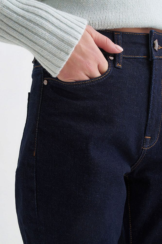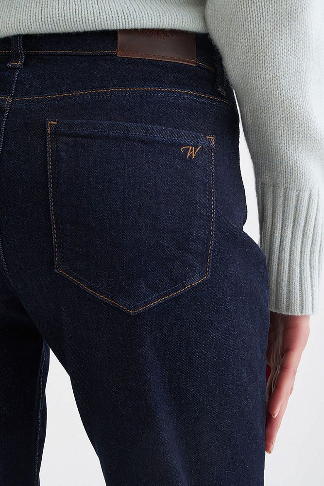 Прямые классические джинсы имеют силуэт Slim Fit, который обеспечивает плотную посадку по фигуре. Такая модель станет универсальной в женском гардеробе — джинсы можно носить как с повседневными футболками, так и с нарядными блузами.