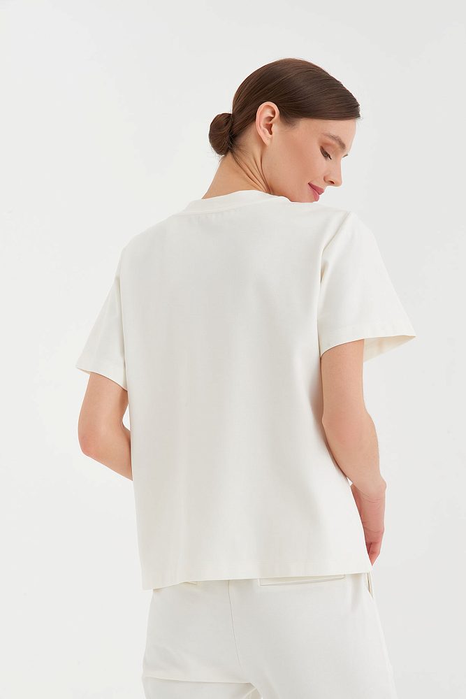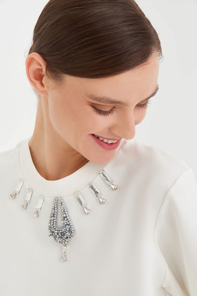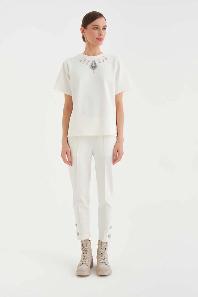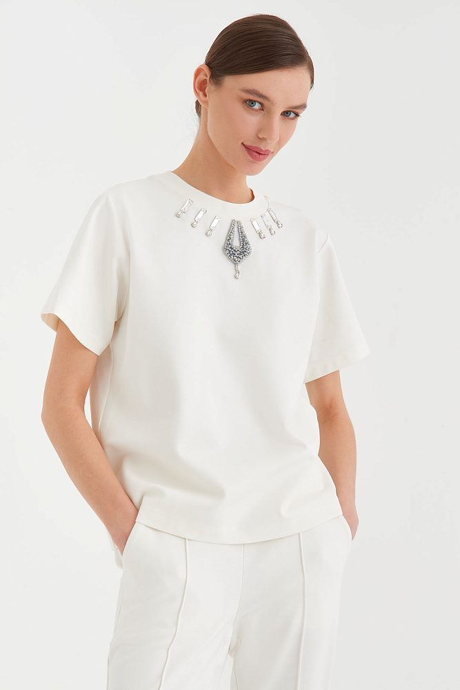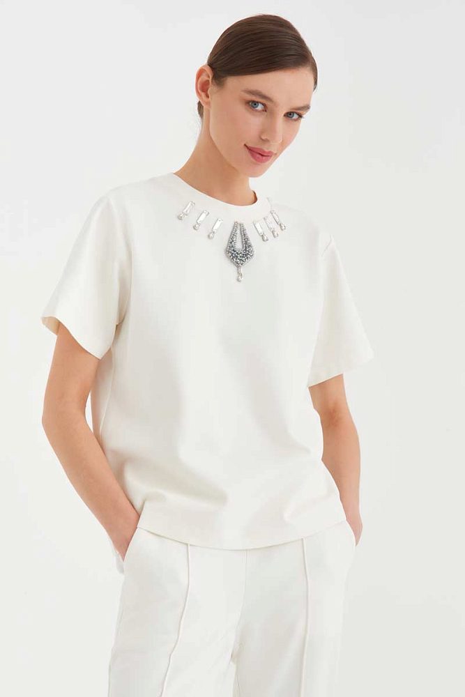 Универсальная, но в то же время совершенно особенная – это про белую футболку с декором из страз от бренда Gizia. Ее можно сочетать практически с любыми элементами вашего гардероба, при этом не тратя время на выбор аксессуаров. Футболка с необычным оформлением горловины просто создана, чтобы придать свежести вашему весеннему образу с пальто, тренчем или жакетом.