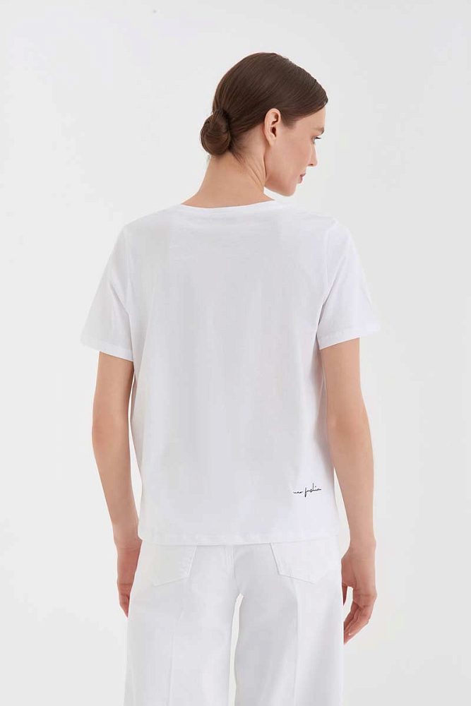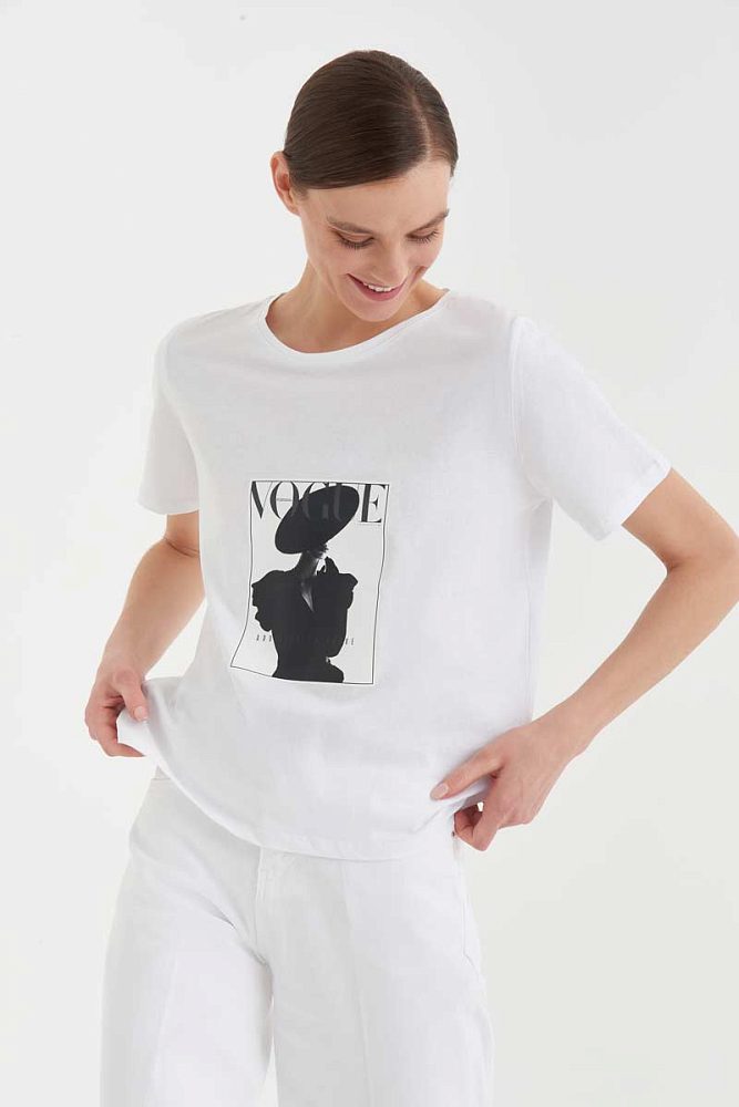 Белая хлопковая футболка с контрастным принтом станет основой для образа практически в любом стиле. Наденьте ее с костюмом на деловую встречу, с юбкой-миди и босоножками на свидание или с кроссовками и бомбером для прогулки за городом.