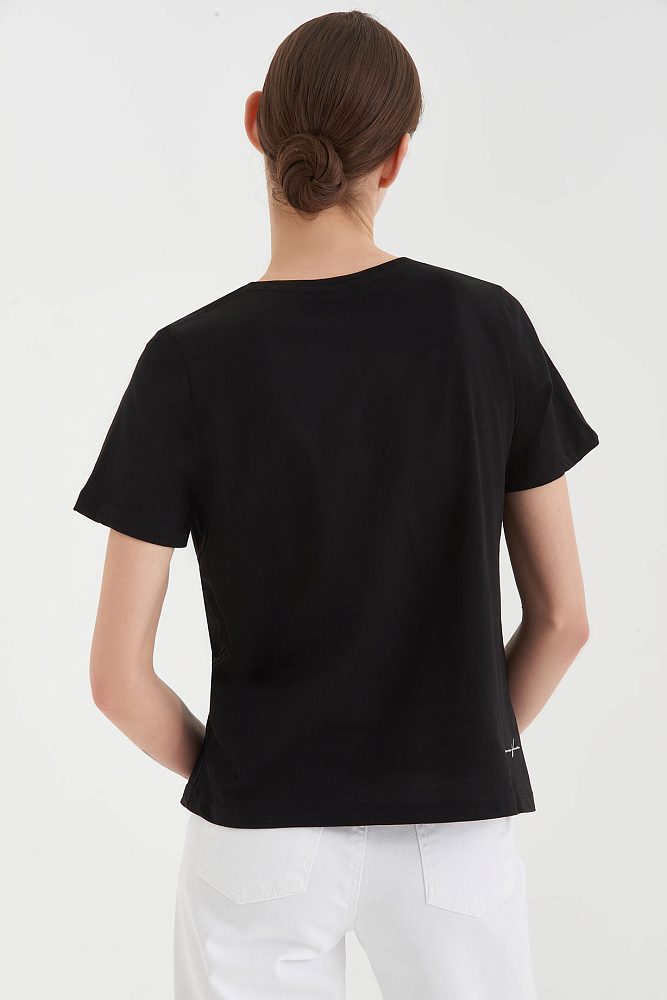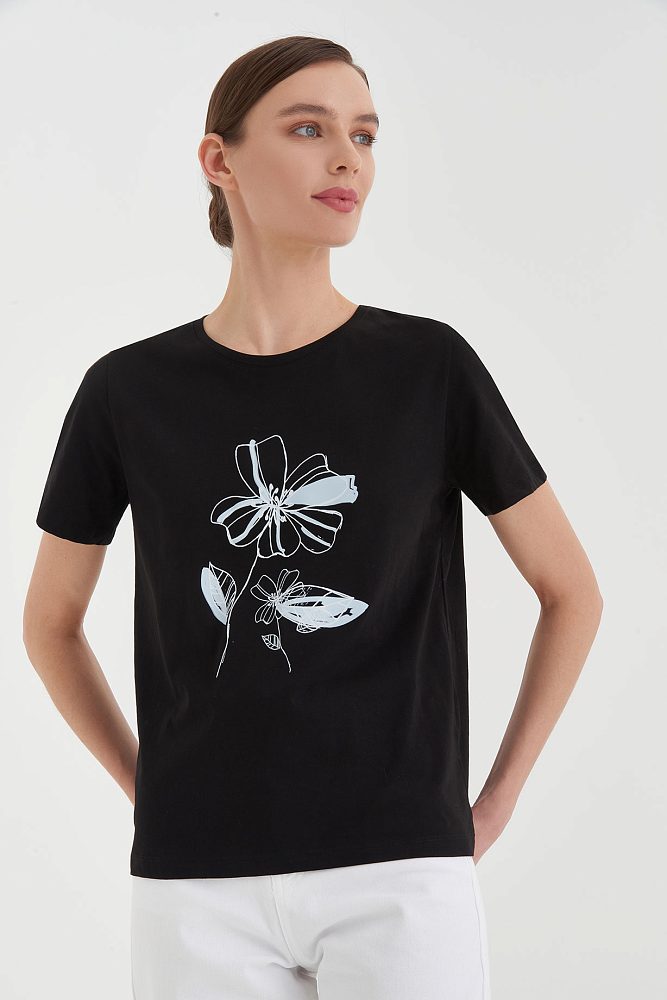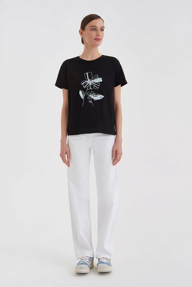 Хлопковая футболка свободного прямого кроя поможет составить актуальный образ практически в любом стиле. Графичный контрастный принт, удобная посадка и качественная ткань — модель незаменима в базовом гардеробе.
