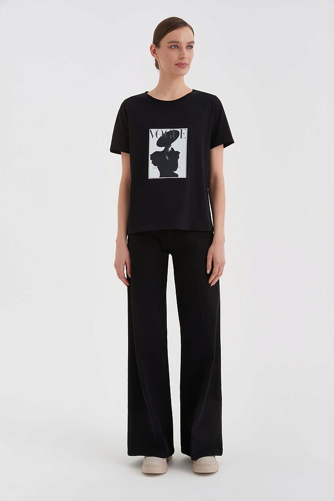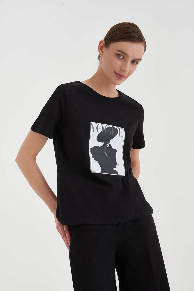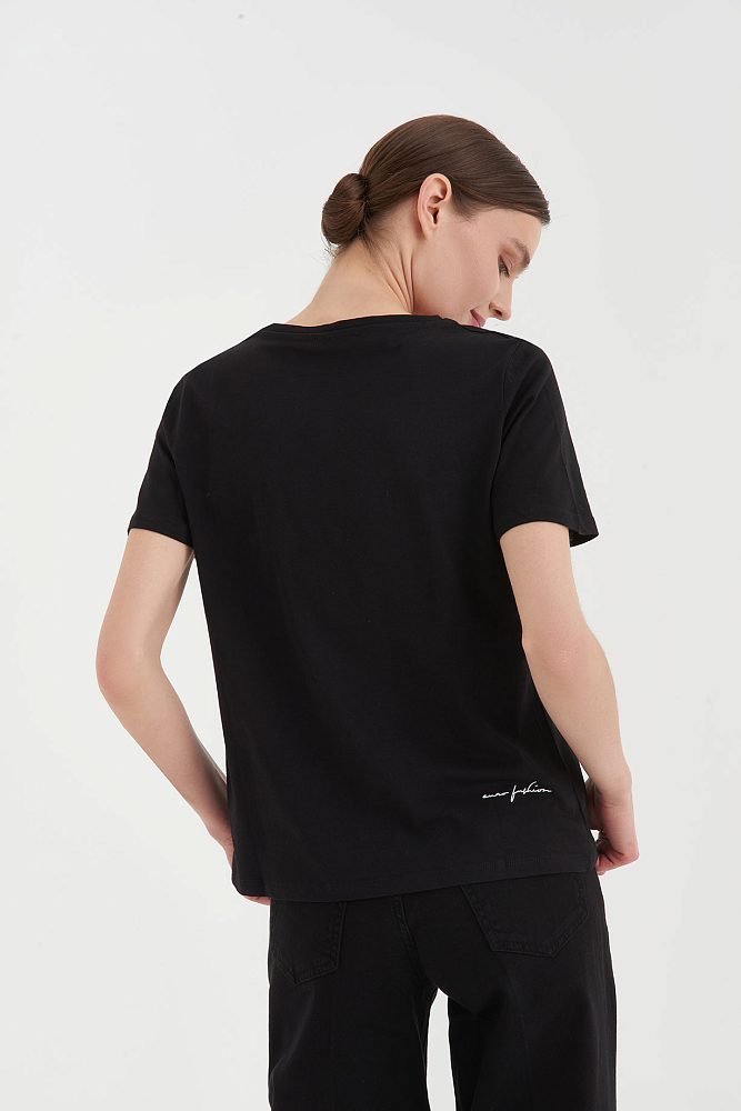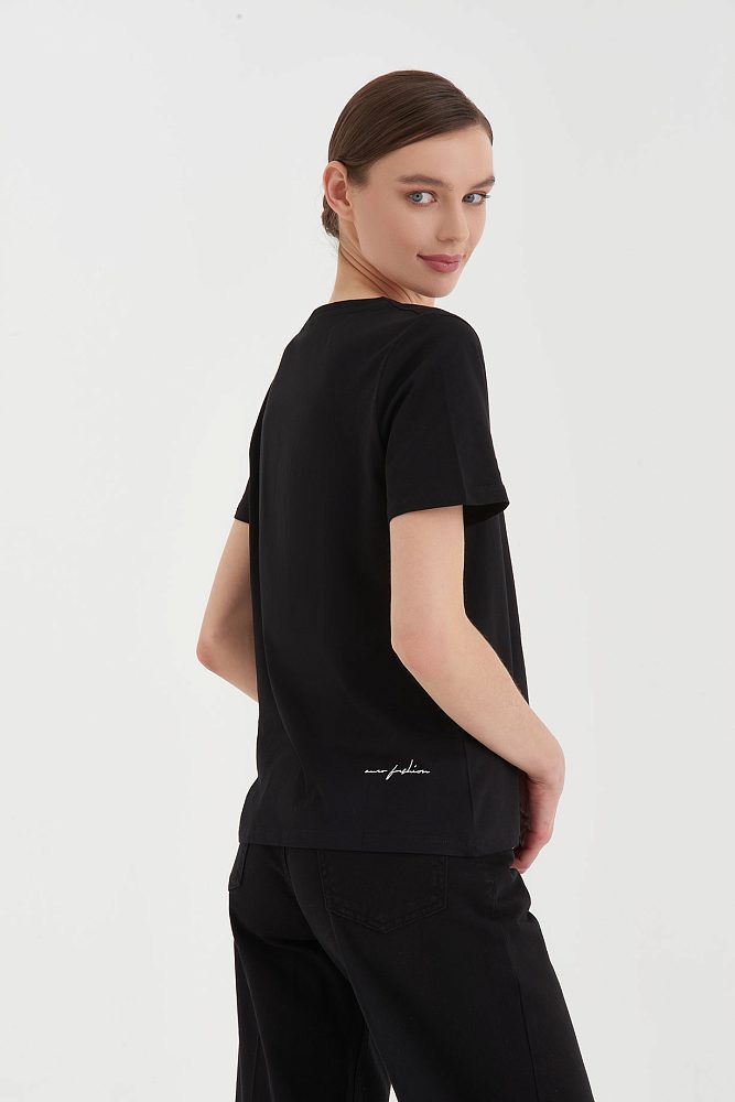 Монохромная футболка — вариант нескучной базы для повседневных и деловых образов. Графичный принт, минималистичный логотип бренда, идеально скроенный втачной рукав: элегантность и стиль читаются в каждой детали. Носите футболку навыпуск или в тандеме с брюками и юбками с высокой посадкой.