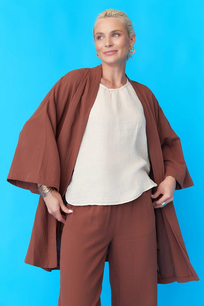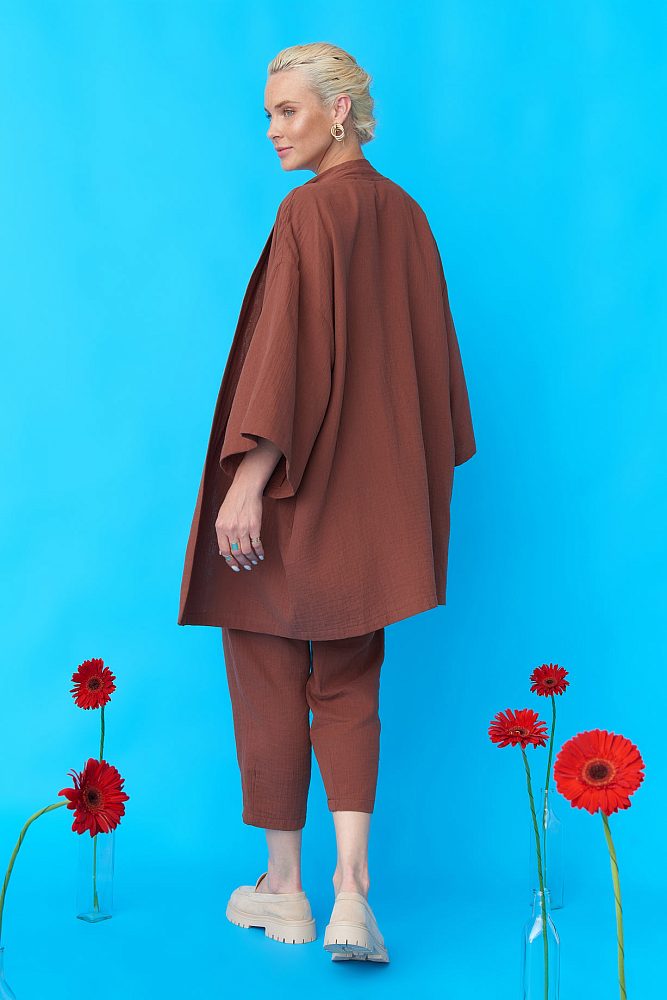 Кимоно из натурального хлопка - это идеальный выбор для тех, кто ценит комфорт и качество. Коричневый цвет добавляет яркости и изысканности, а пояс подчеркивает талию и создает элегантный силуэт. Это киноно идеально подойдет для повседневной носки или для создания пляжного образа. Оно изготовлено из высококачественного хлопка, который обеспечивает комфорт и мягкость при носшении. Кимоно имеет свободный и комфортный крой.