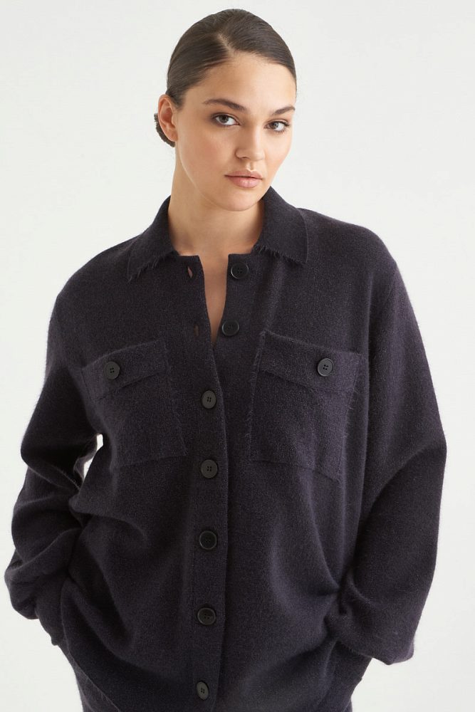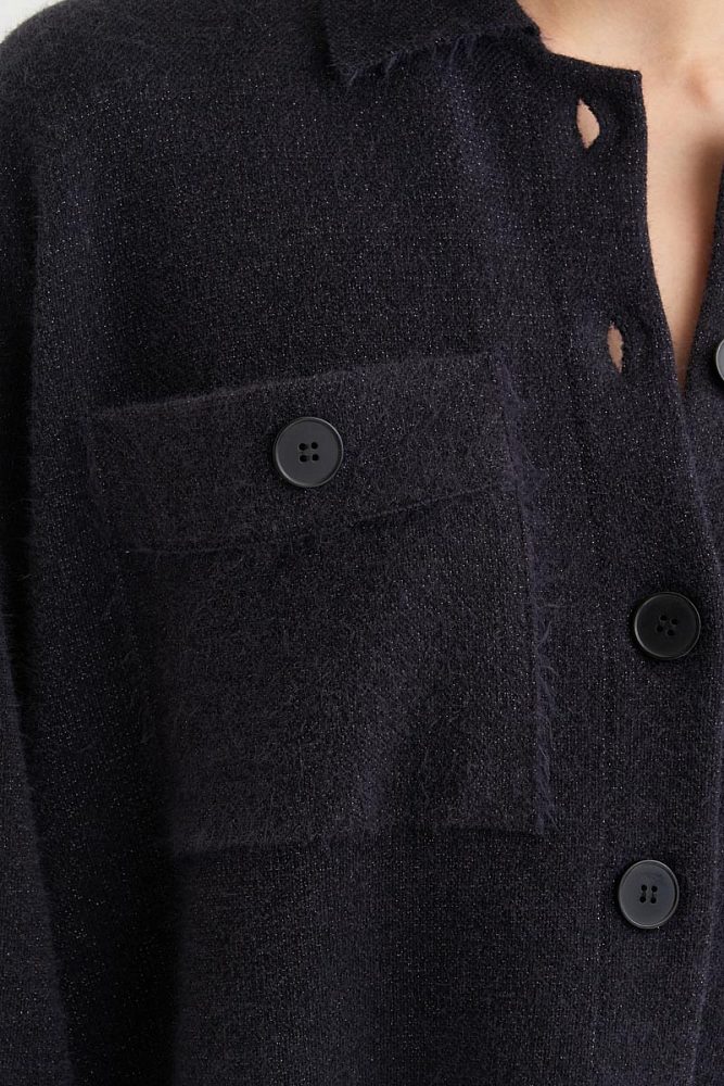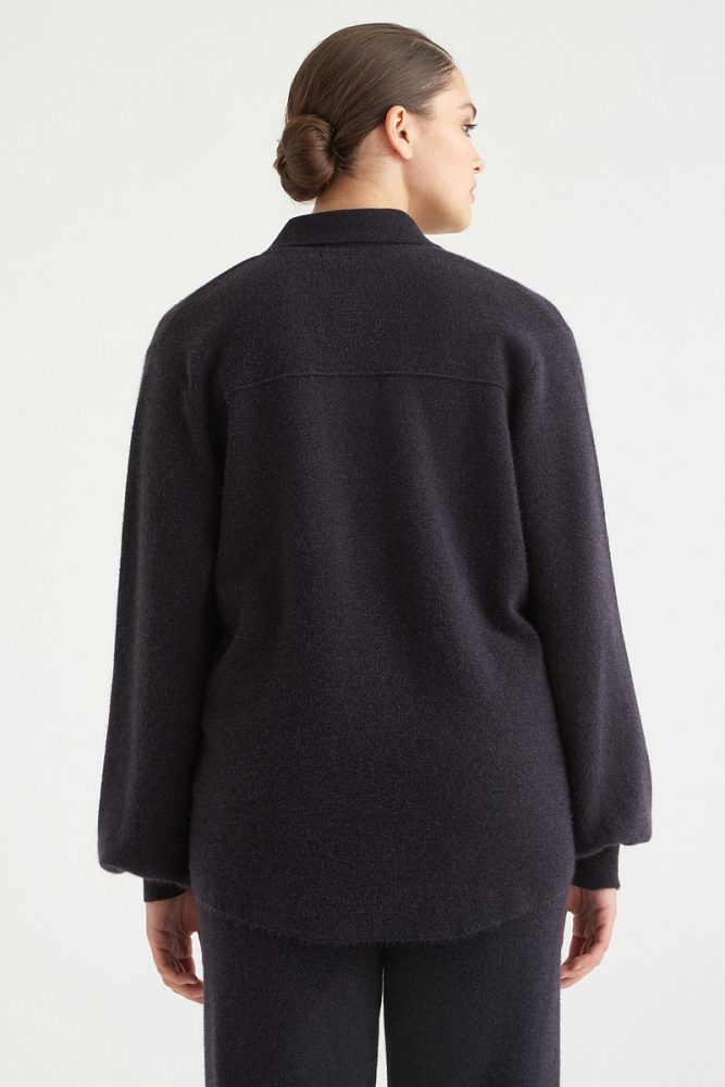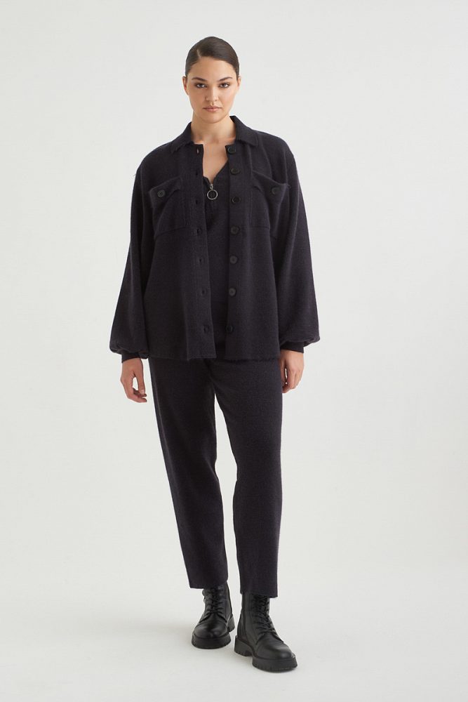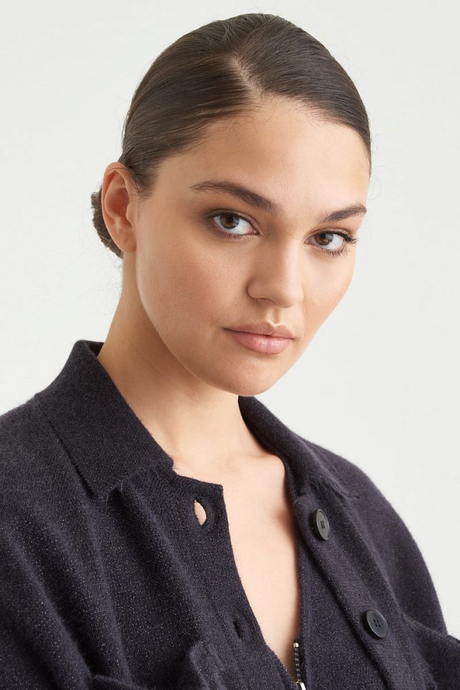 Жакет свободного кроя в рубашечном стиле с объемными рукавами будто взят у возлюбленного из шкафа, но при этом отлично садится на женскую фигуру и не выглядит слишком объемным. Добавление люрексовой нити в составе ткани придает изделию деликатный дорогой блеск.
