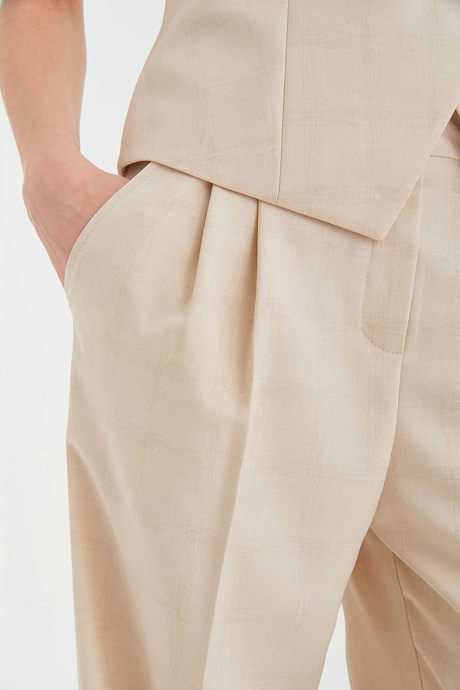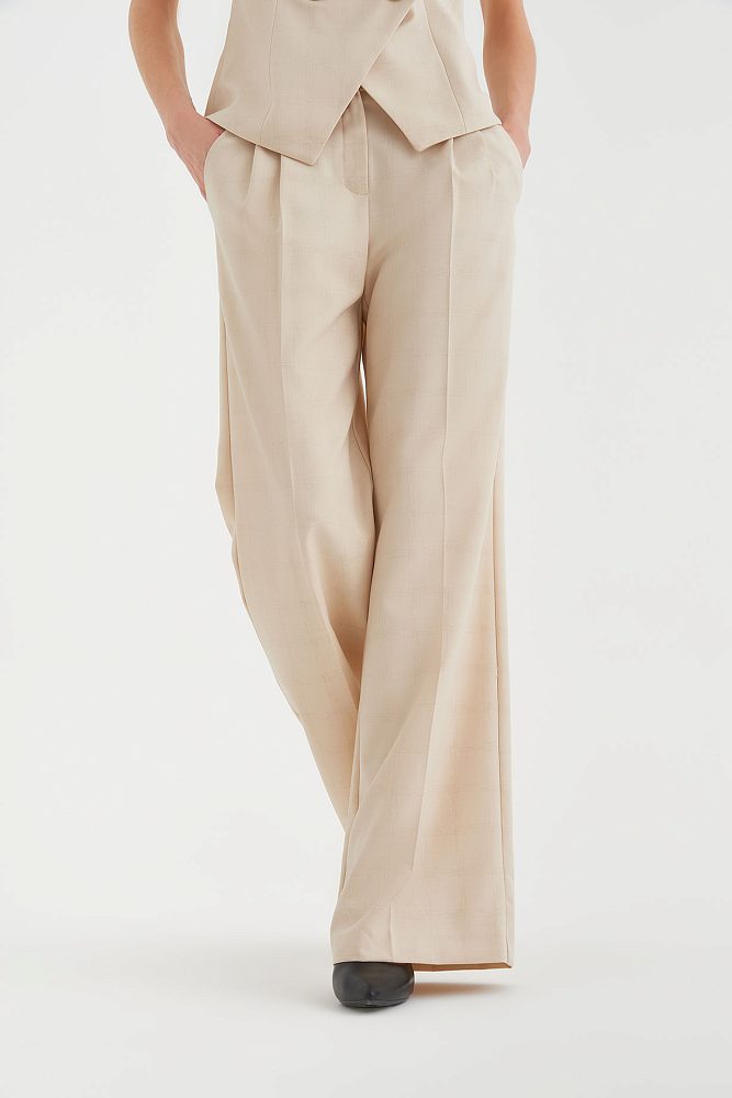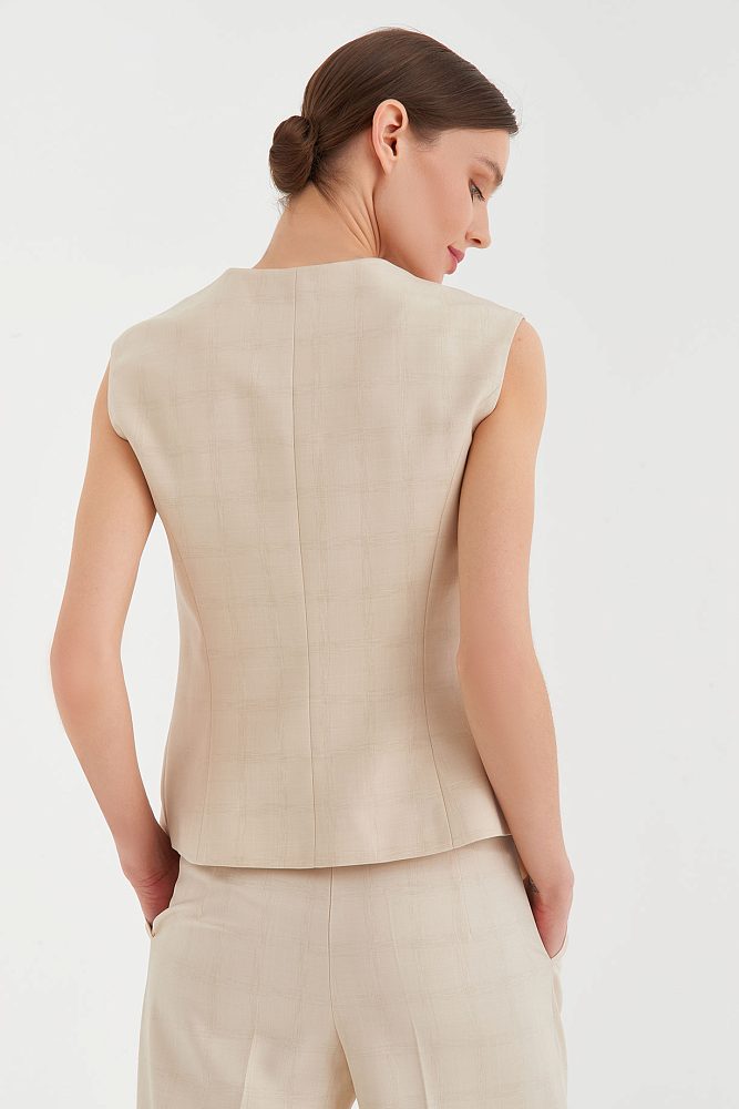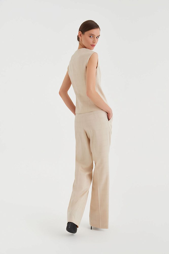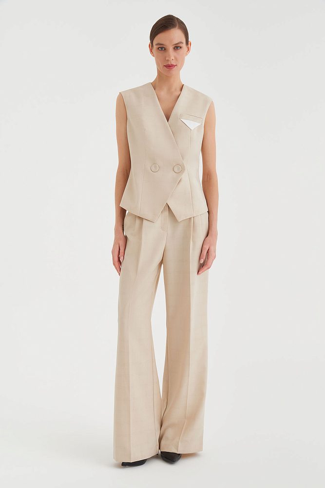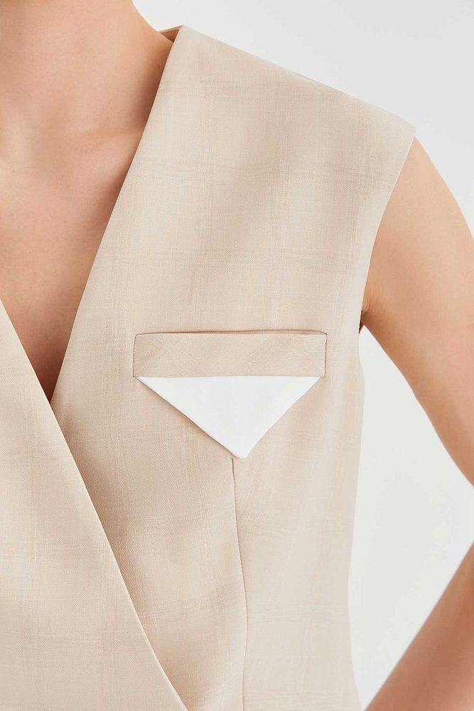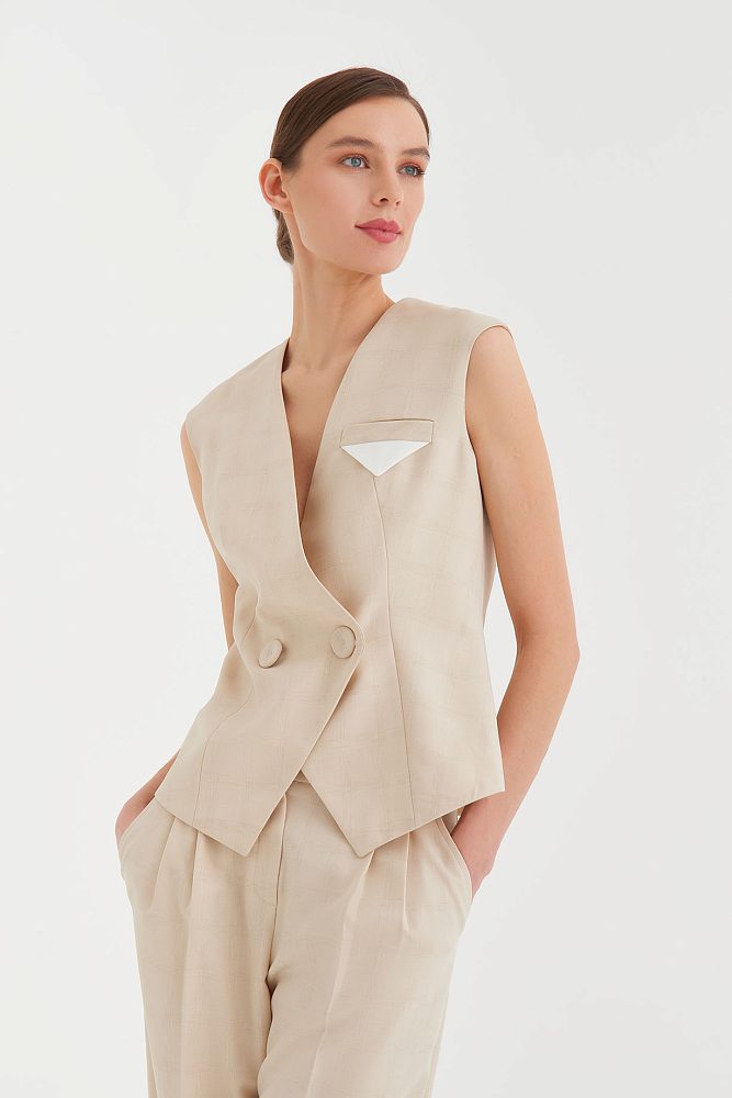 В коллекциях сезона весна-лето 2023 дизайнеры часто фантазировали на тему униформы. Бренд 4 G Classic использовал этот тренд при создании костюма-двойки. Сочетание широких брюк со стрелками и двубортного жилета – это идеальный баланс строгости и непринужденности. Костюм представлен в двух универсальных оттенках – бежевом и серо-голубом, а на ткань нанесен едва различимый принт в клетку, который добавляет комплекту элегантности.