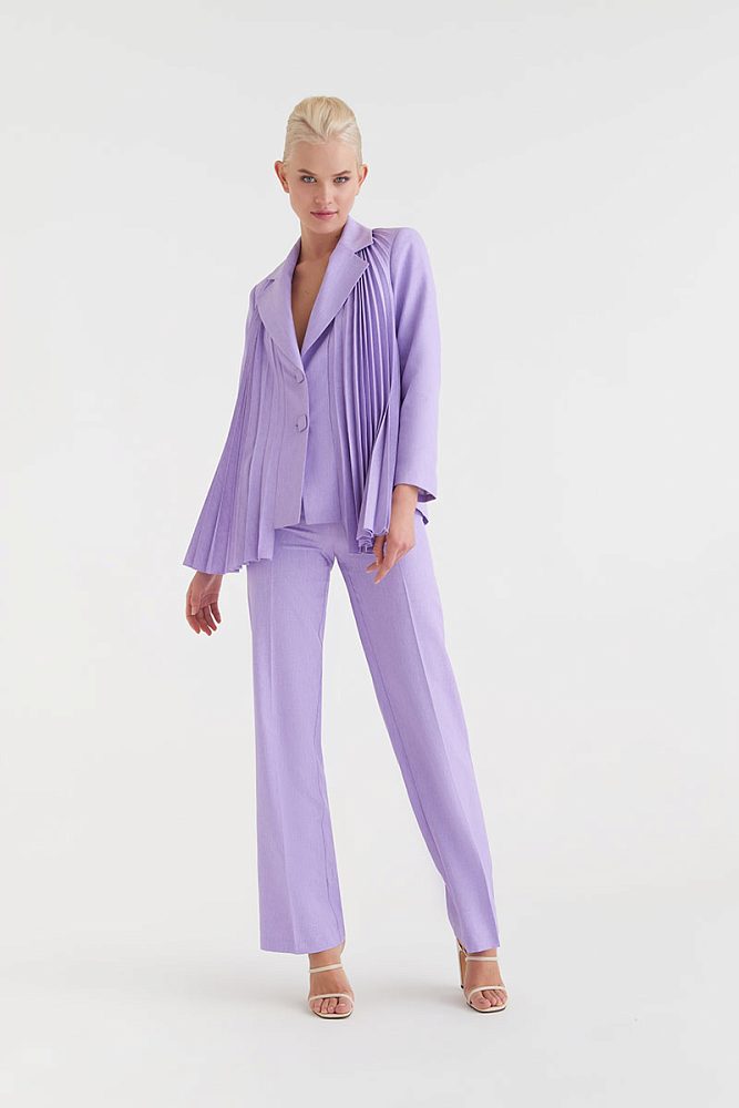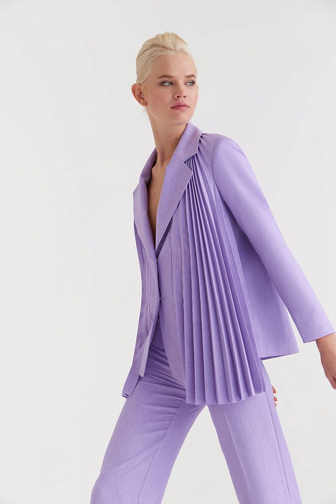 Такой костюм точно не оставит вас без внимания на любом мероприятии: жакет с плиссированными вставками смотрится одновременно статусно и нарядно, поэтому его можно надеть и на работу, и на особый случай. Брюки со стрелками великолепно сидят по фигуре и подчеркивают ее достоинства.