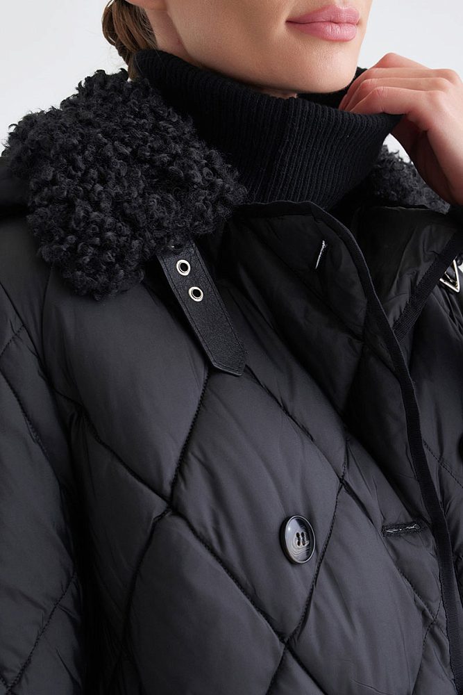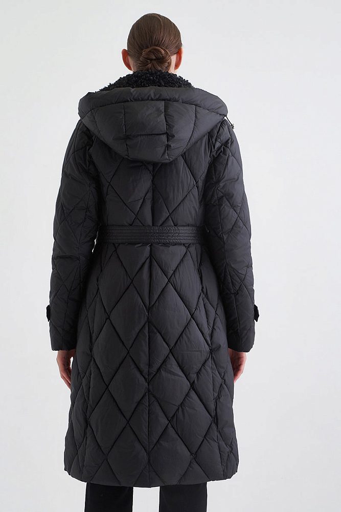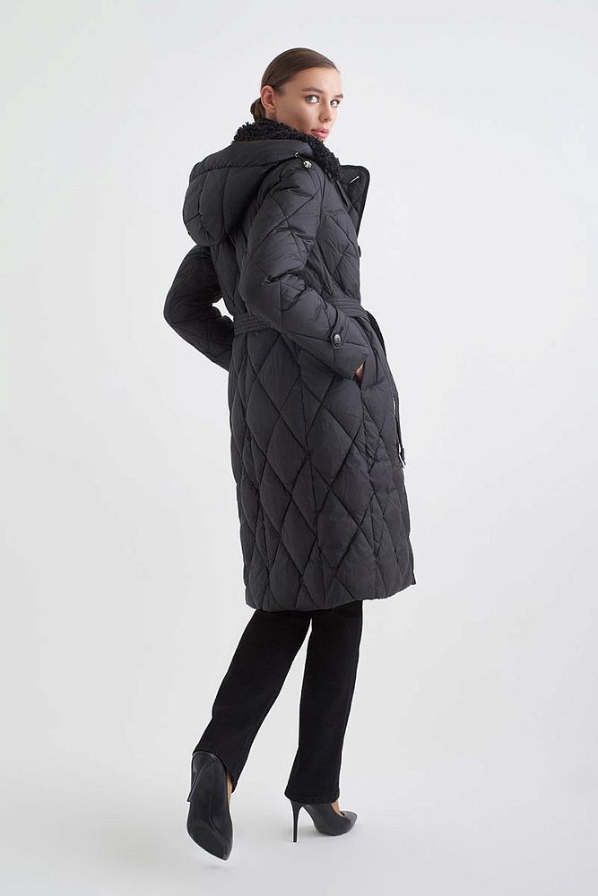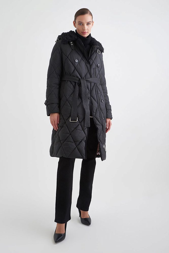 Удлиненное стеганое пальто в классическом черном цвете — универсальная основа зимнего гардероба. Модель выполнена из высококачественного полиэстера с технологией защиты от воды и утеплением внутри. Пальто возможно носить более расслаблено или затянуть поясом для создания приталенного силуэта. Натуральный мех на капюшоне способствует ощущению тепла, защищенности, уюта, необходимого для зимней вещи.