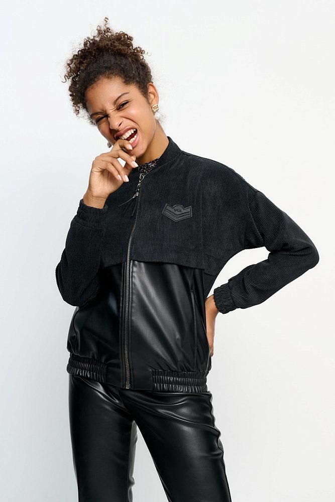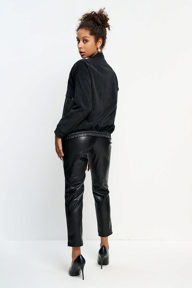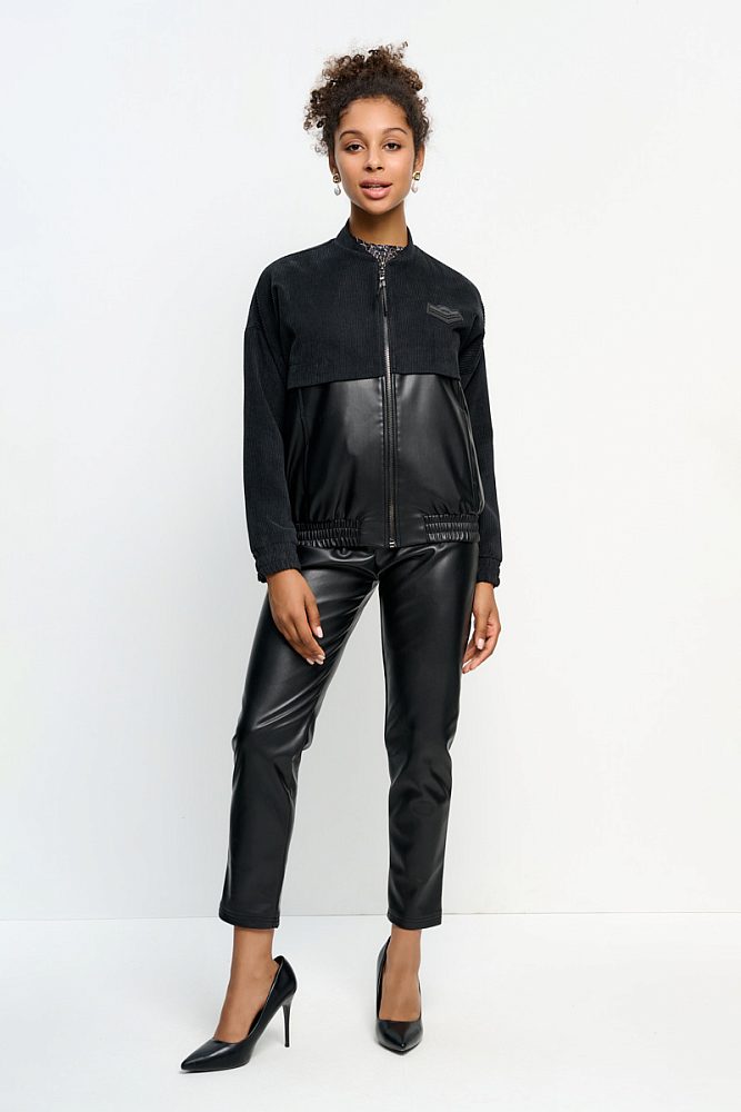 Стильный бомбер на молнии с прорезными карманами имеет необычную двойную фактуру. Ткань обладает приятными тактильными свойствами и долго сохраняет свой первоначальный внешний вид.Такой укороченный жакет будет отлично смотреться с джинсами-трубами или брюками-палаццо. Зимой бомбер может стать основой многослойного образа, если надеть его под куртку.