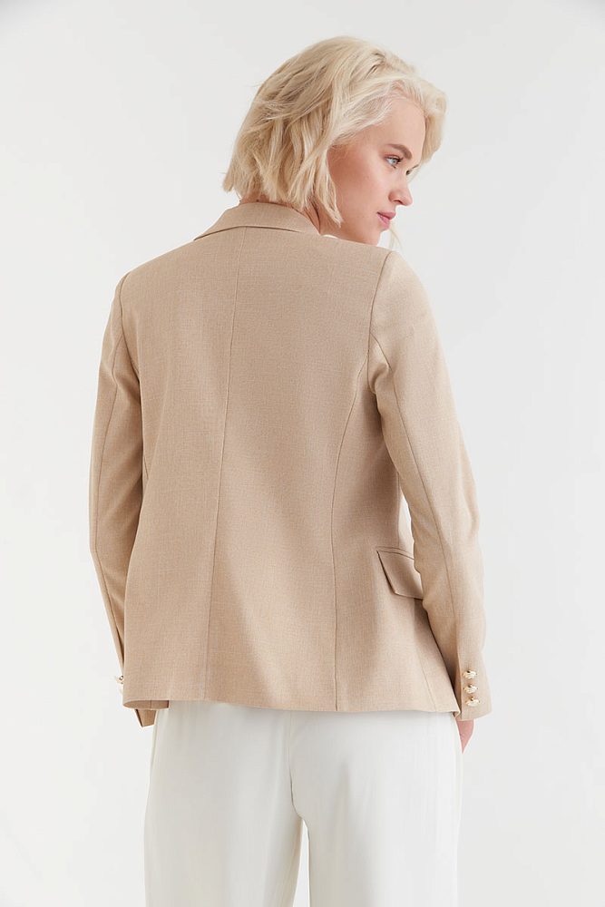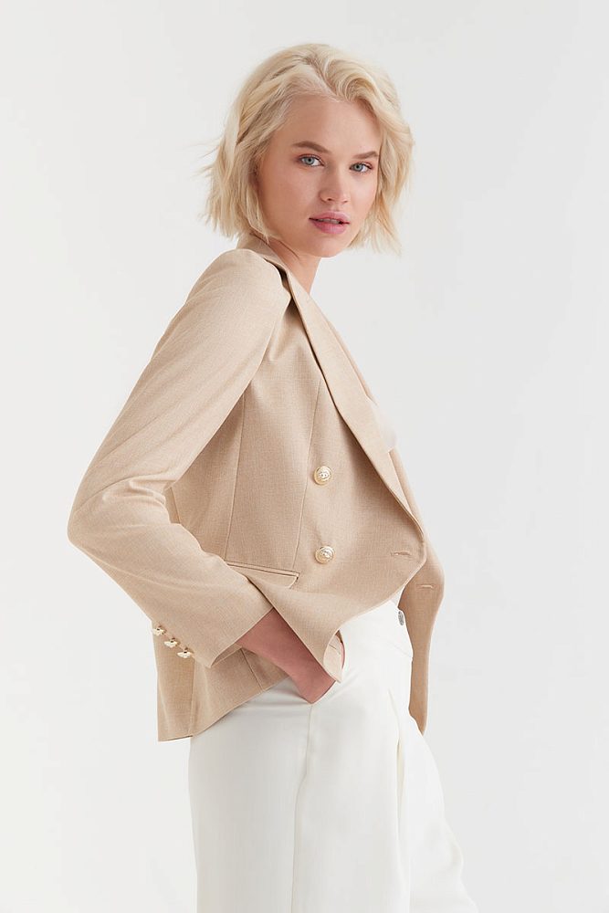 Приталенный двубортный пиджак с асимметричным кроем и акцентными пуговицами позволит вам составить эффектный образ даже без украшений. Модель идеально садится по фигуре, подчеркивает талию и структурирует силуэт.