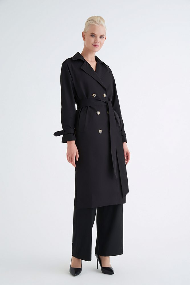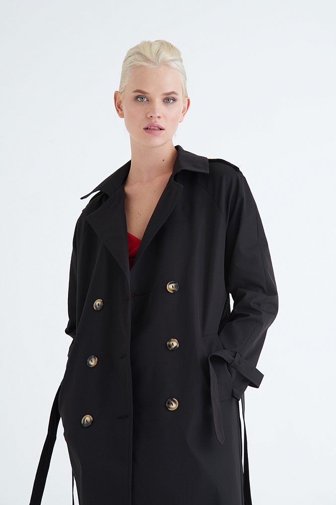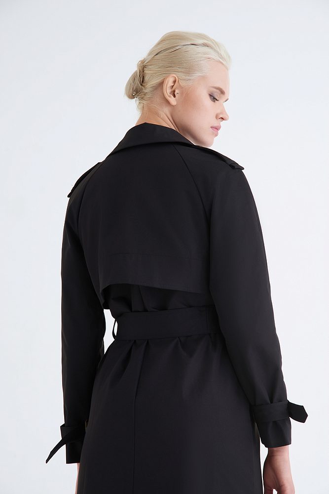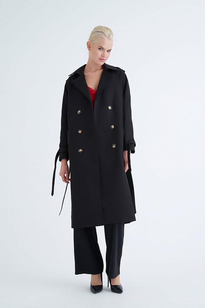 Двубортный тренч с поясом  и отложным воротником рисует благородный графичный силуэт. Акцентные пуговицы, эполеты и паты на рукавах привлекут к вам восхищенные взгляды, а качественная плотная ткань и удобные карманы позволят чувствовать себя комфортно и уютно.