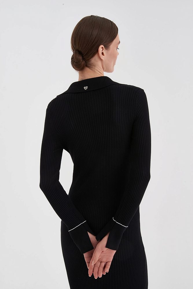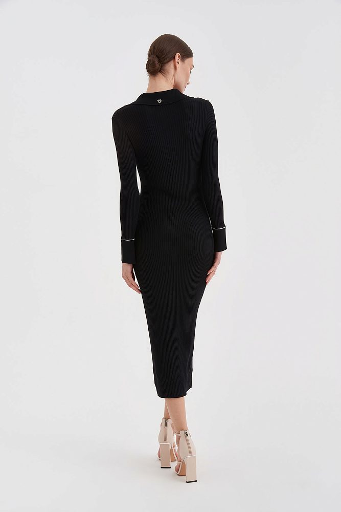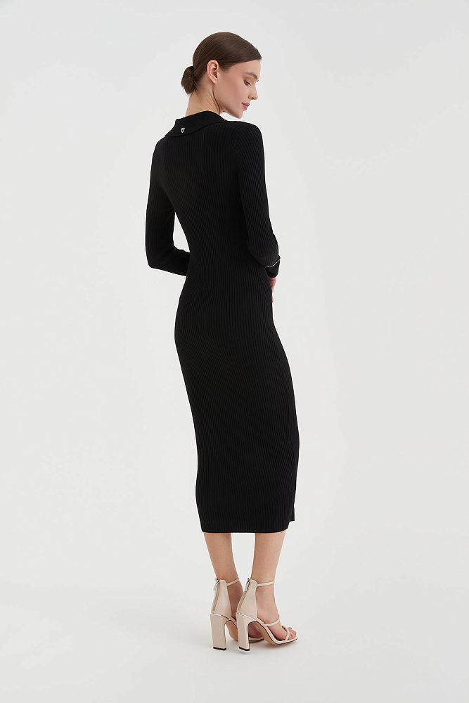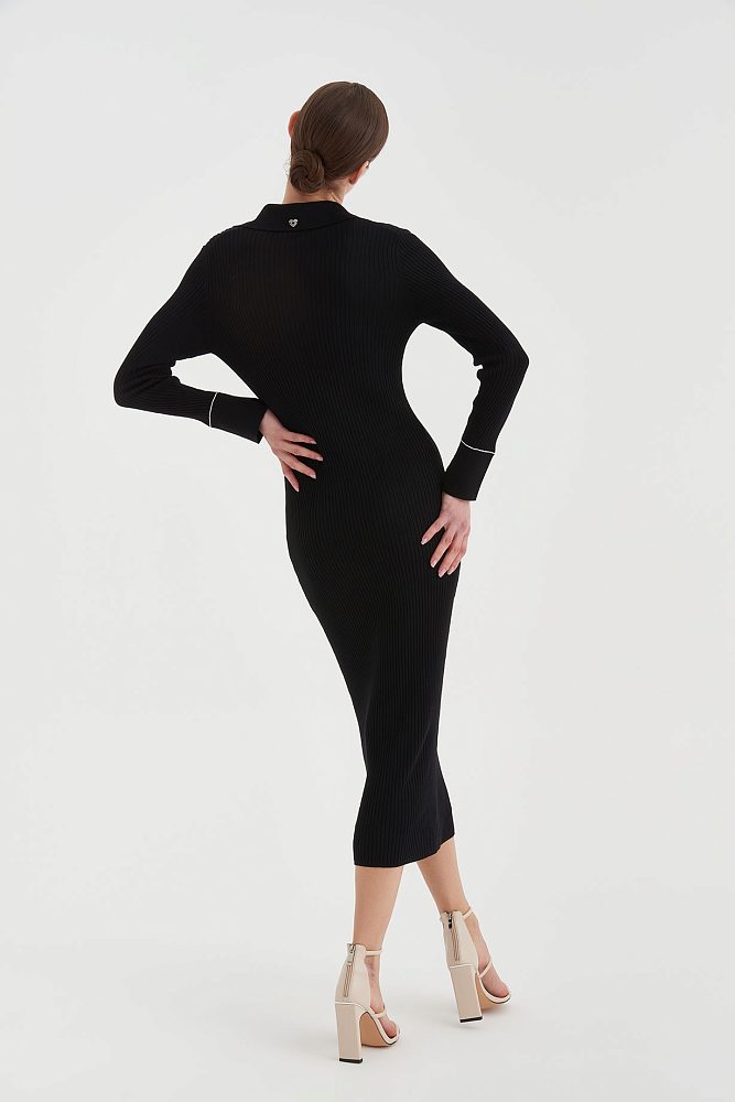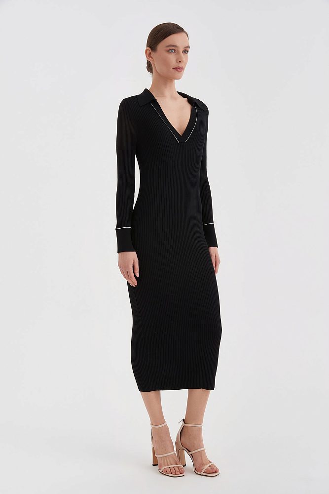 Трикотажное платье по фигуре в модной в этом сезоне длине миди можно носить на прогулку или создать элегантный образ для формального мероприятия. Акцентный вырез подчеркивает изящное декольте, а длинные облегающие рукава придают визуальную стройность.