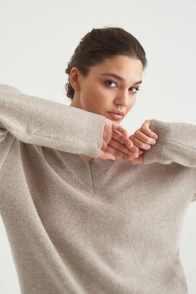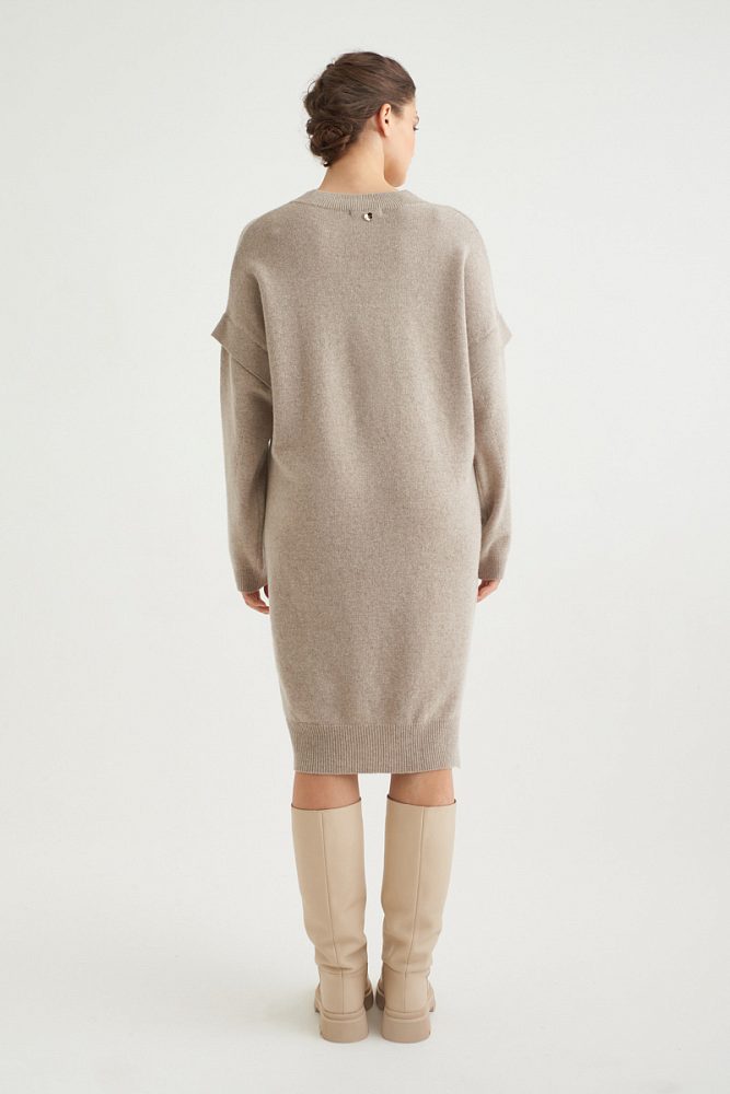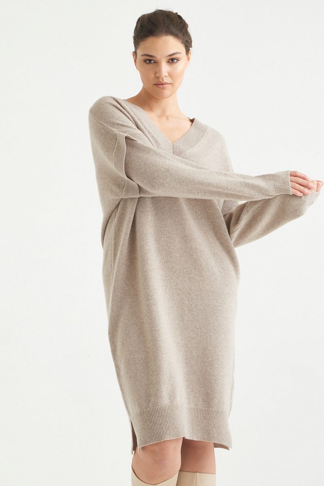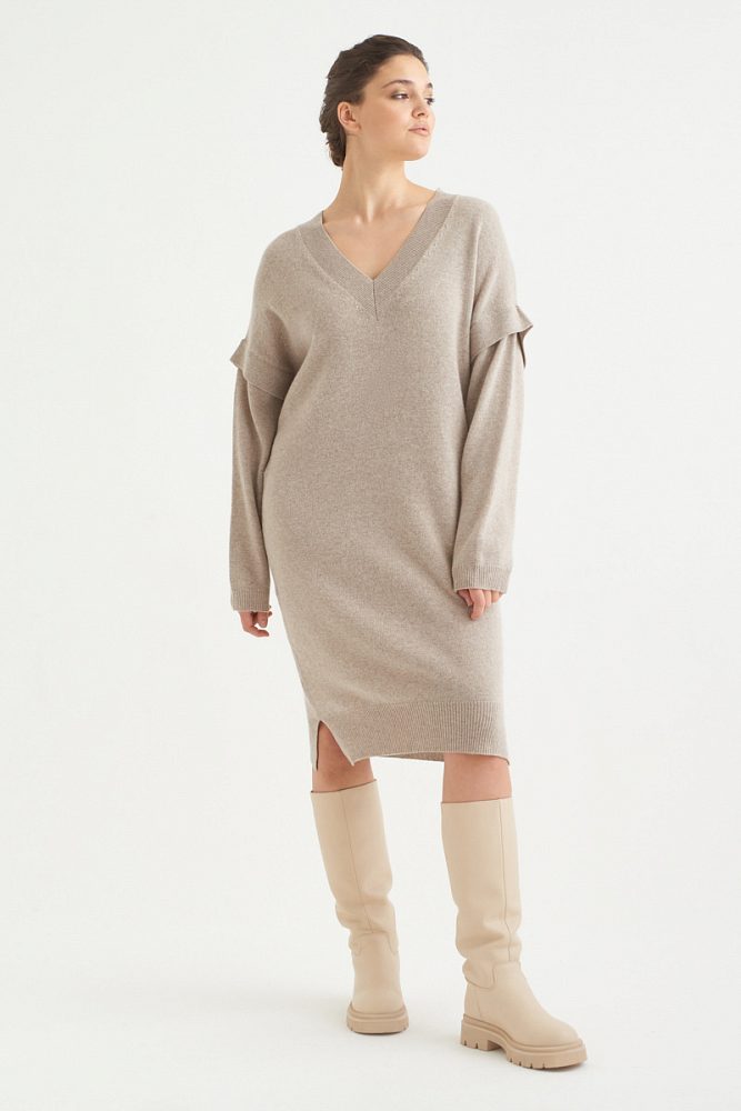Платье с добавлением нежного кашемира создано для максимально расслабленных уютных образов. V-образный вырез подчеркивает декольте и ключицы, визуально удлиняя силуэт. Рукава двойной длины и лаконичный разрез по линии колена добавляют базовой модели платья оригинальности и привлекают внимание к вашему образу.