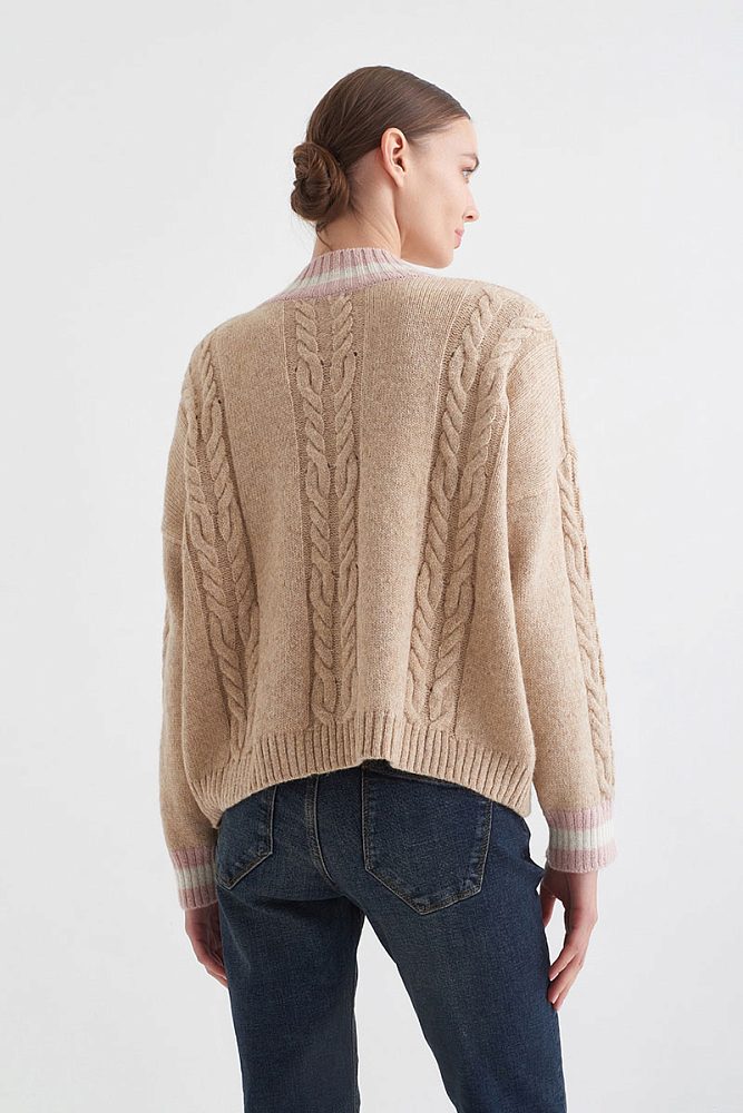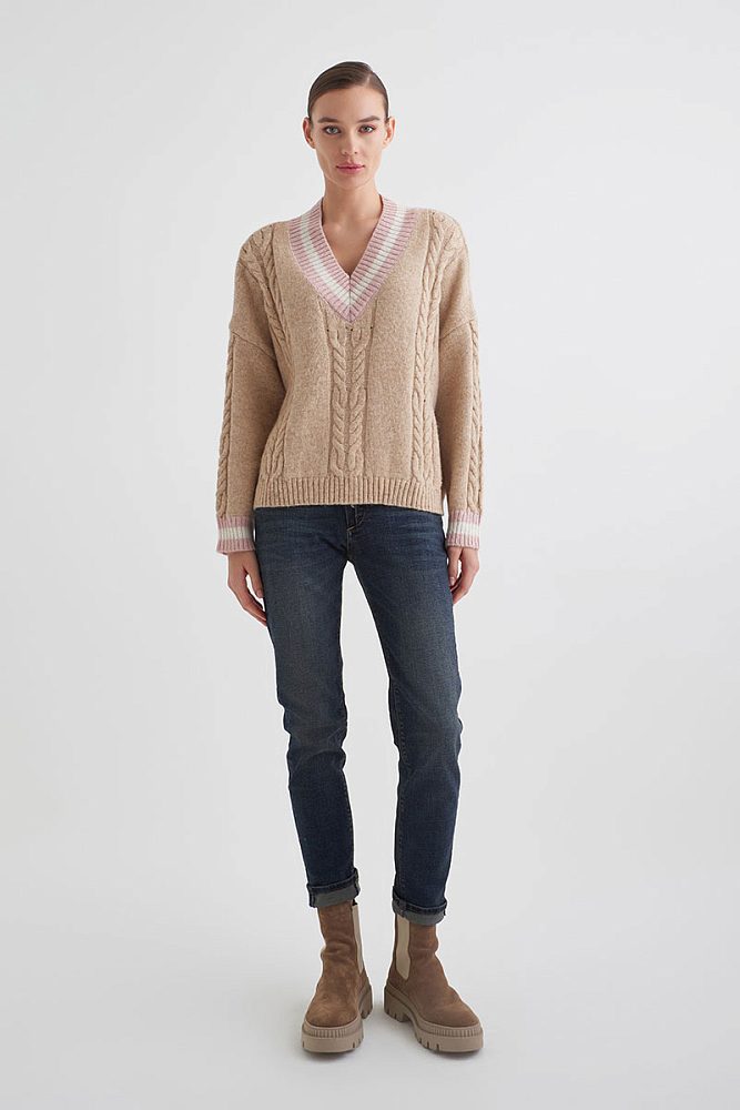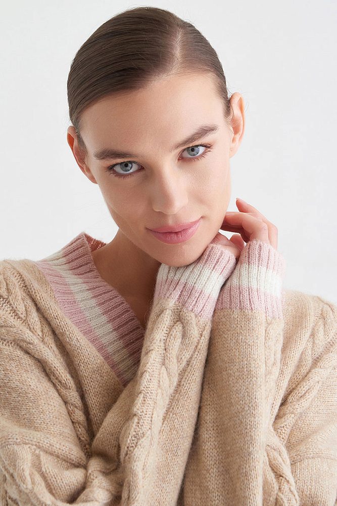 Oversize-пуловер с «плетеным» узором — вневременная классика. V-образный вырез с принтом-полоской и цитирующие принт манжеты рукавов — грамотно расставленные акценты на базовой модели. Деним в сочетании с такой моделью пуловера выглядит сложнее, юбки прямого кроя — не такими строгими, а образы с вязаными брюками настраивают на отдых.
