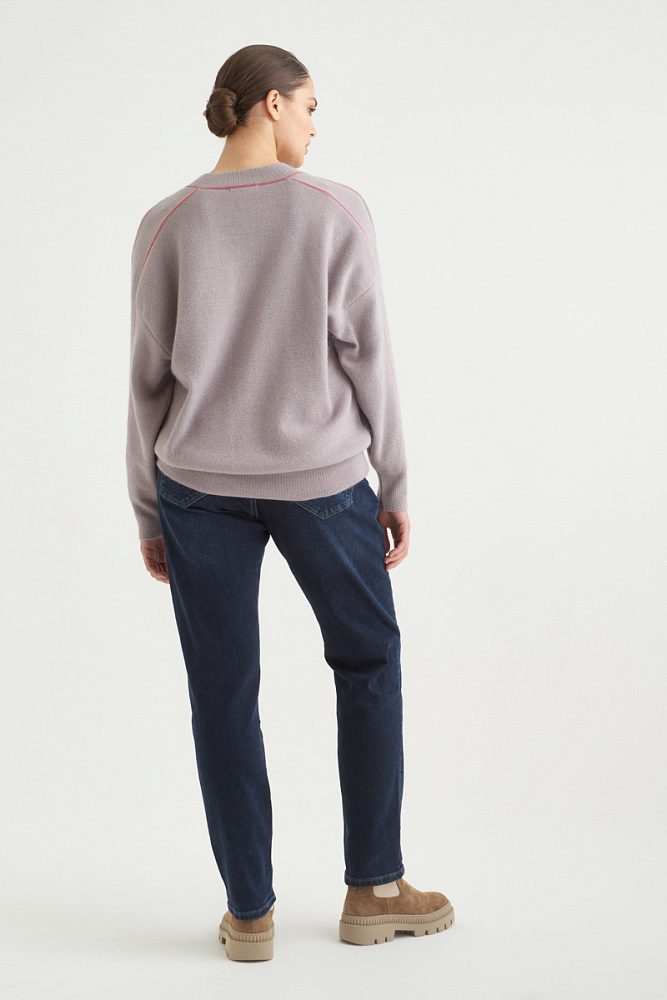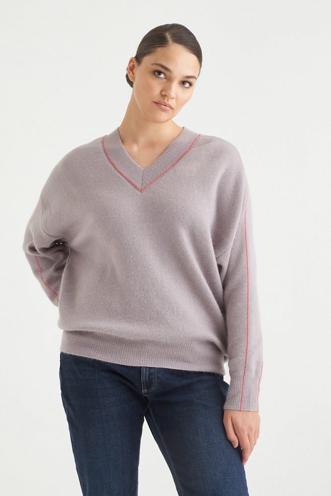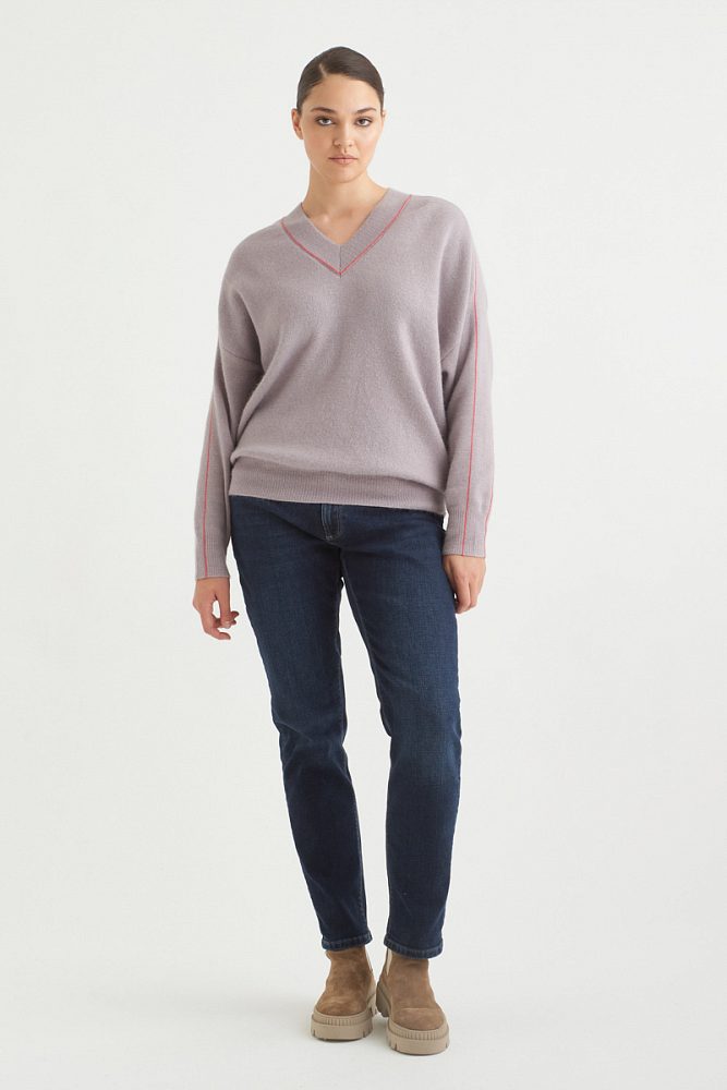 Лаконичный пуловер с V-образным вырезом и декоративной акцентной полосой легко встроится в любой гардероб. Комфортная средняя длина с широким поясом позволяет стилизовать пуловер с любым низом: от джинсов до костюмных брюк.