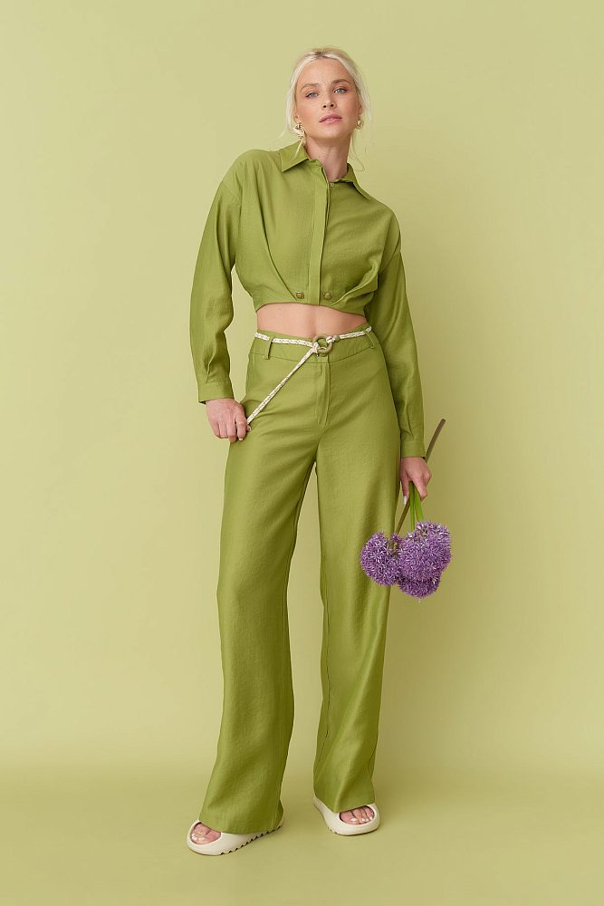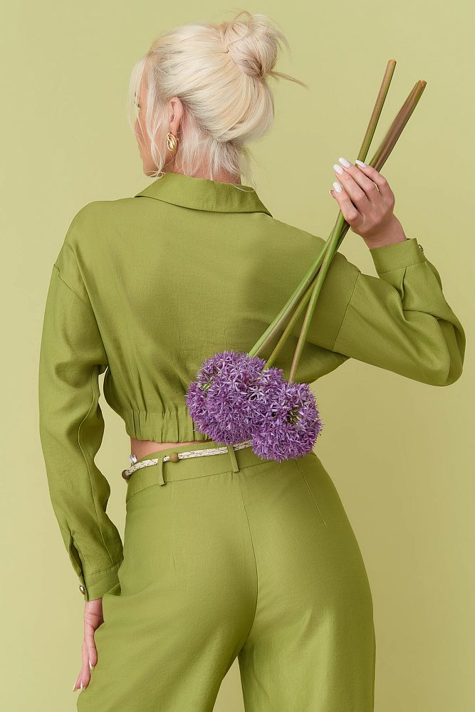 Сделайте заявление с костюмом, где вытачка – это эстетика образа! Получите современный и утонченный вид. Благодаря сочному теплому цвету, длинным прямым брюкам с высокой талией, необычному ремню и укороченной рубашкой с воротником, длинным развевающимся рукавом флаттер и манжетам вы обязательно выделитесь из толпы.