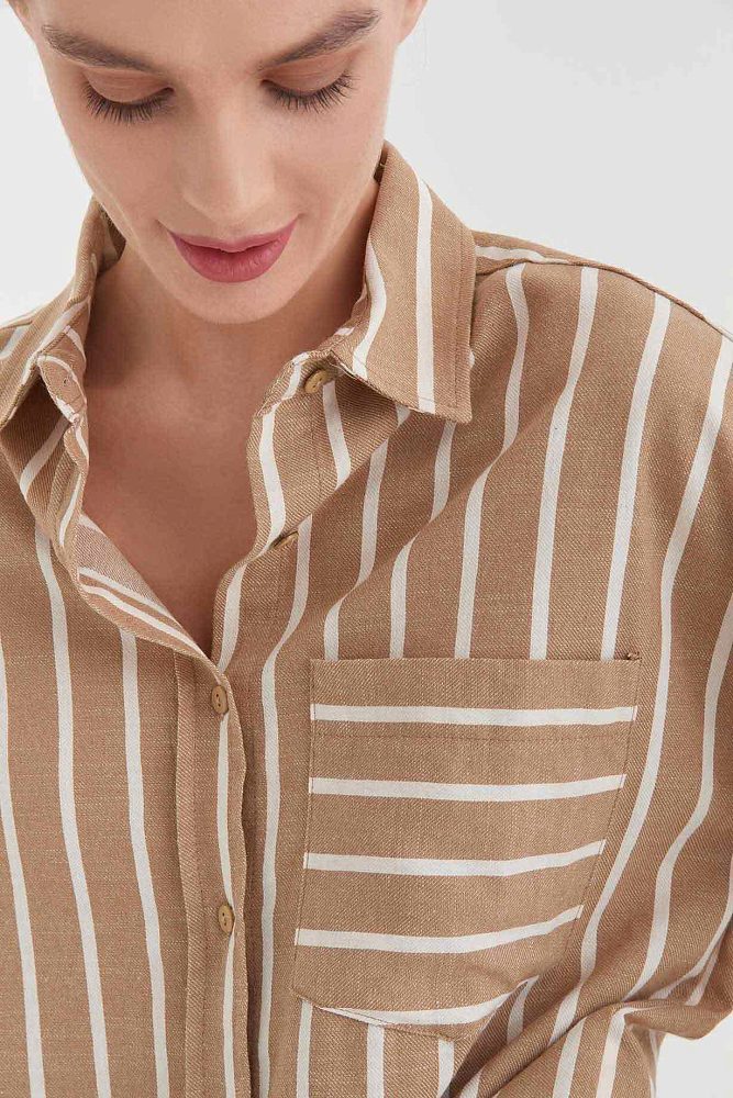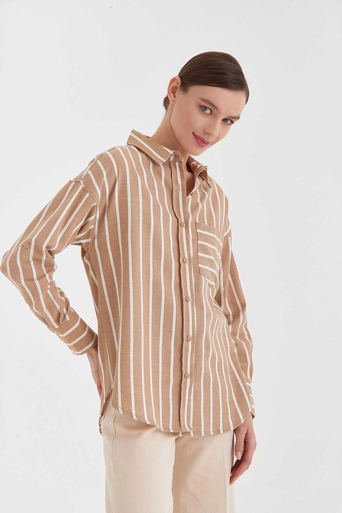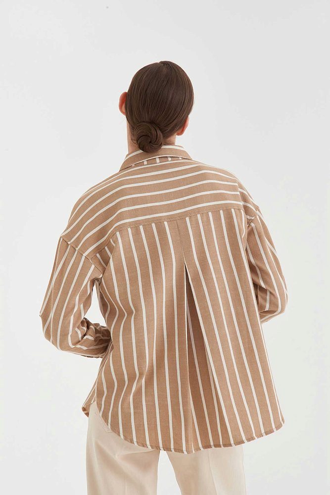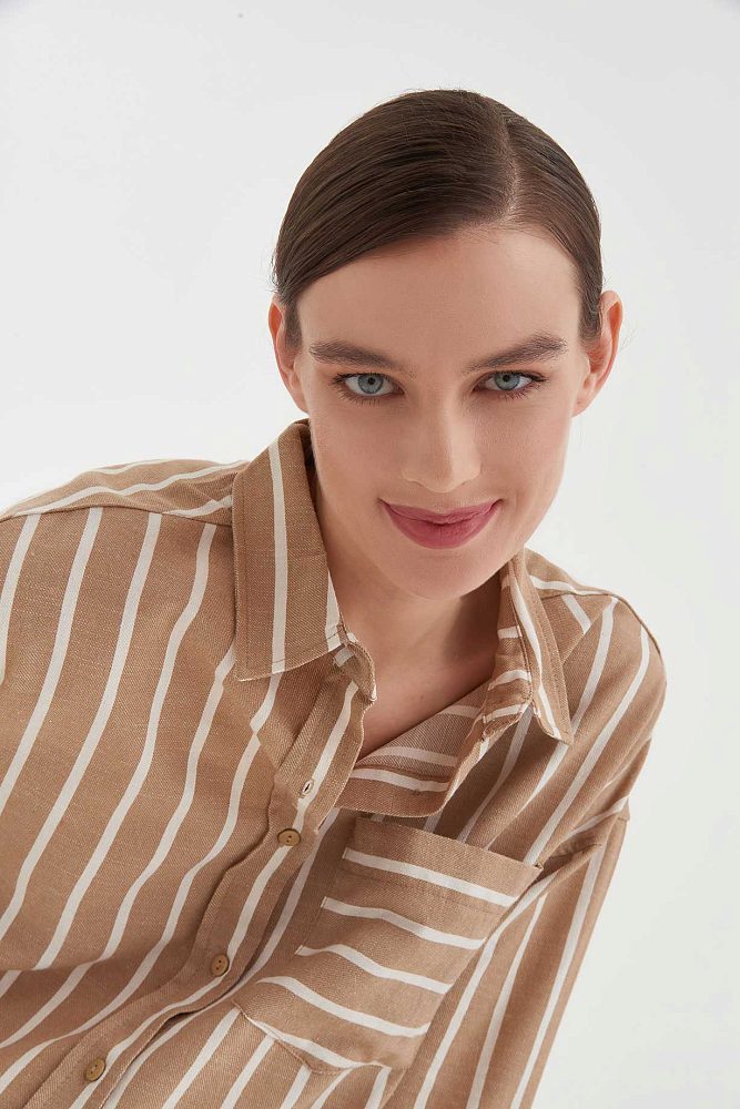 Oversize рубашка на пуговицах спокойного нюдового цвета — универсальный элемент базового гардероба. Белые полосы и карман с поперечным принтом добавляют образу ритма. Длинные рукава можно подвернуть и зафиксировать с помощью паты.