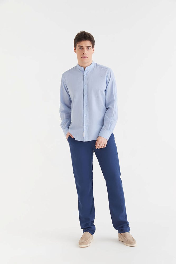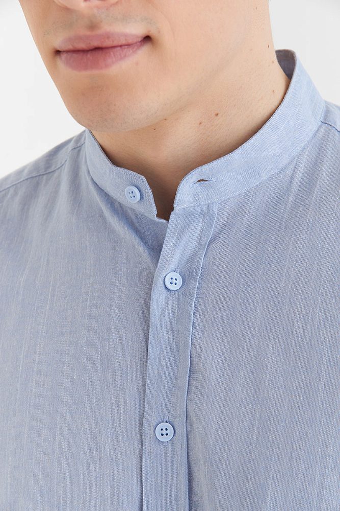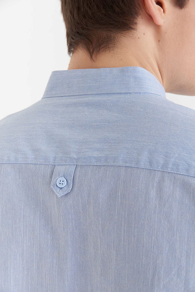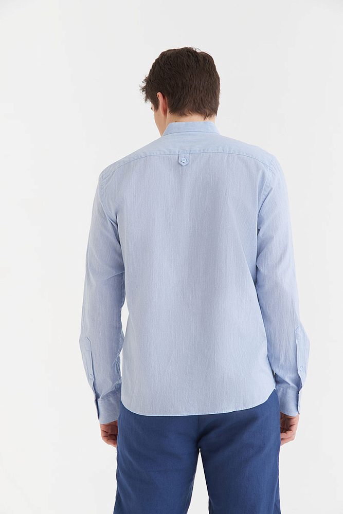 Мужская рубашка на пуговицах оригинального кроя выполнена из 100% натурального хлопка, поэтому отлично подходит для носки как летом, так и в межсезонье. Обратите внимание на воротник — необычная деталь снижает градус официоза, и такую модель легко вписать в неформальный образ.