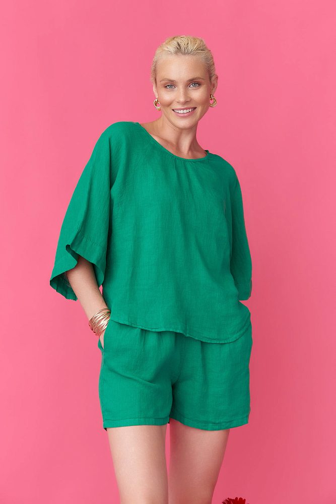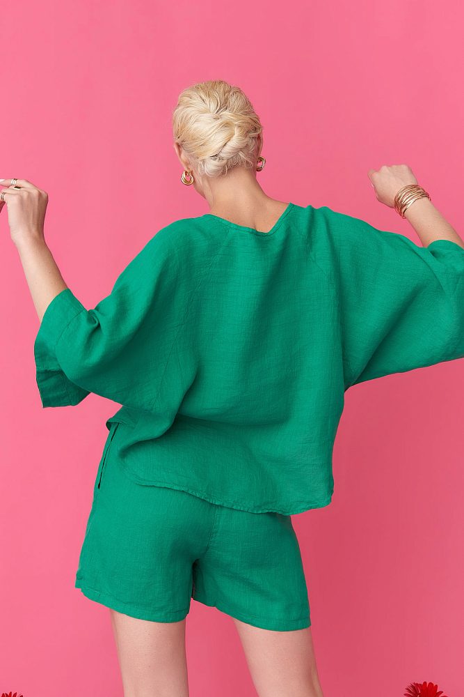 Топ оверсайз с рукавом "летучая мышь" из 100% натурального льна создаст комфортные ощущения в жаркую погоду и станет отличным дополнением аутфита как на пляж, так и на прогулку по городу в жаркую летнюю погоду.