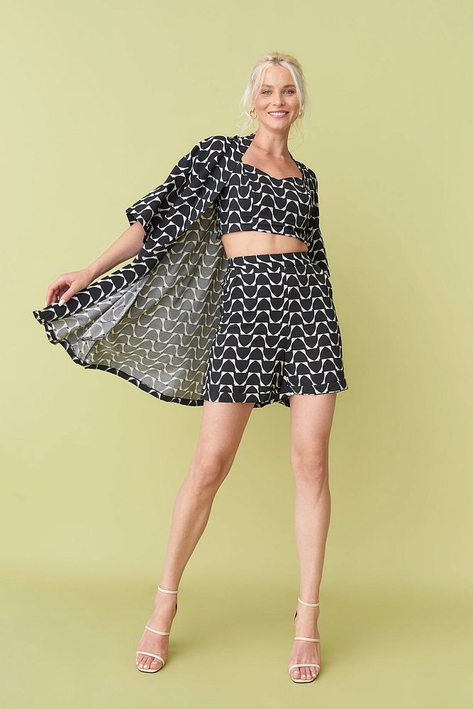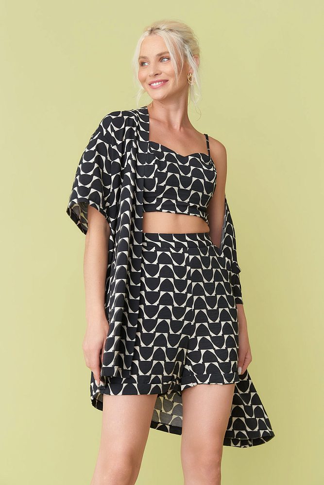 Будьте готовы выглядеть на все сто в этом сезоне с этими стильными и удобными женскими шортами! Эти шорты из 100% хлопка имеют симметричный геометрический принт, высокую посадку и подходят для всех типов фигур. Кроме того, они имеют красивый черно-молочный цвет, который легко сочетается с любым нарядом. Дополните образ топом и кардиганом из этой коллекции!