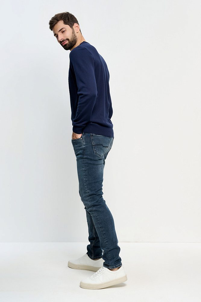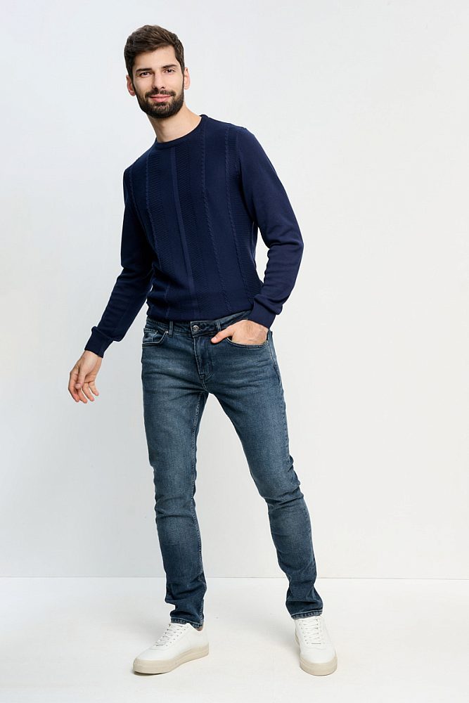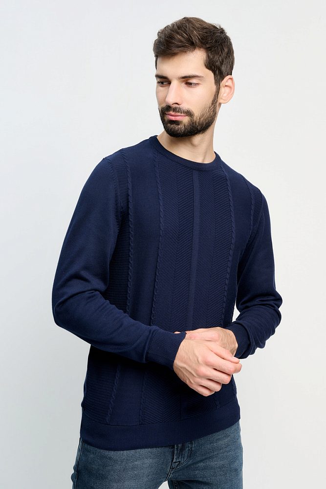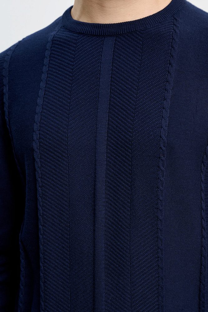 Полуприлегающий свитер с длинными рукавами и круглым вырезом идеален для образов как в классическом стиле, так и в стилях кэжуал и смарт-кэжуал. Ткань из хлопка и акрила хорошо сохраняет тепло и приятна к телу. Однотонная модель декорирована фактурной продольной вязкой.