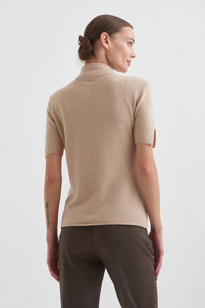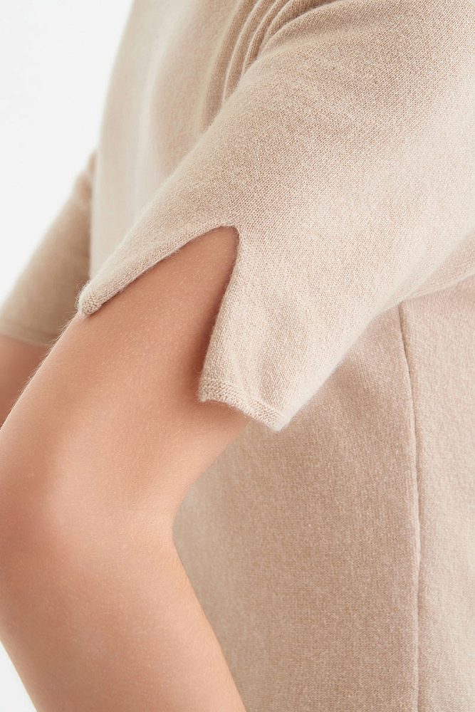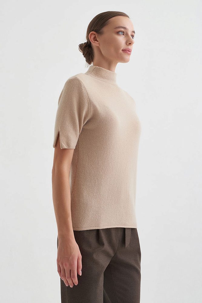 Джемпер прямого кроя в нейтральном кремовом оттенке станет основой casual-образов и заменит футболку в прохладную погоду. Модель выполнена из тонкорунной шерсти мериноса и нежного кашемира, которые обеспечивают комфортную посадку. Лаконичный воротник-стойка и укороченные рукава с деликатными разрезами — утонченные и нежные акценты модели.