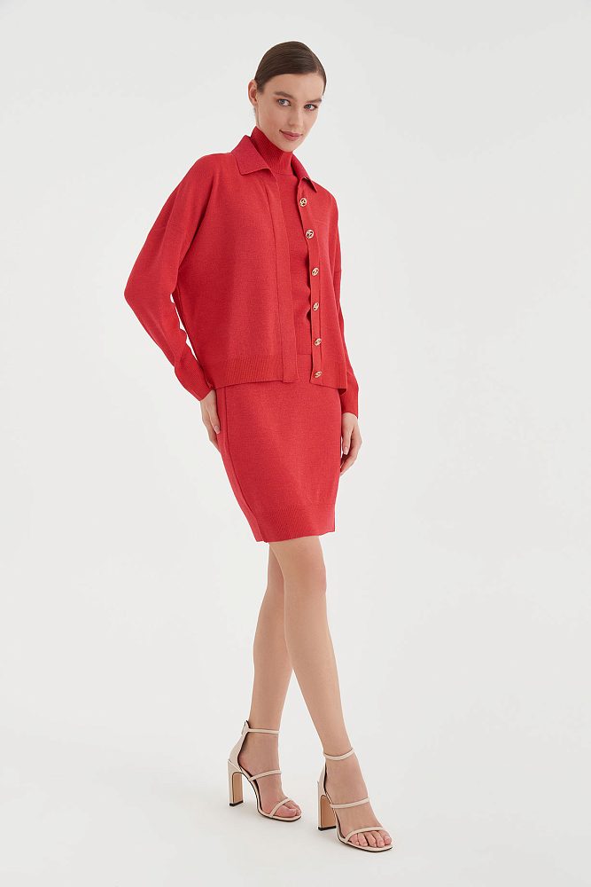 Трикотажная мини-юбка из акрила в сочном алом цвете — то, что нужно в межсезонье для создания игривого настроения. Чередуйте строгий и расслабленный верх, чтобы получить разные по характеру образы: в офис — с рубашкой, на свидание — с топом и кардиганом в тон юбке.