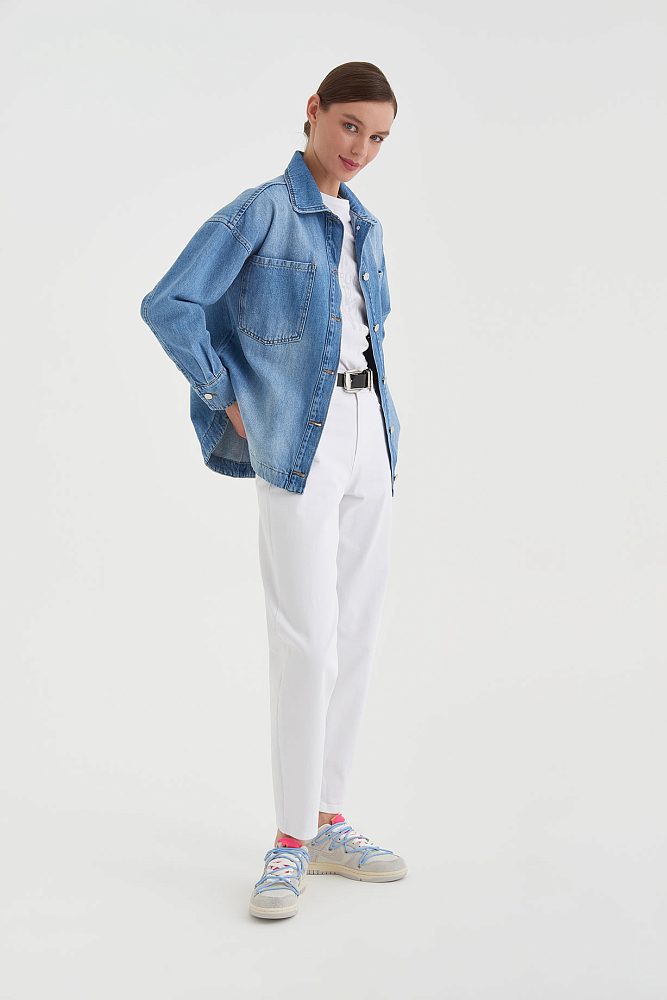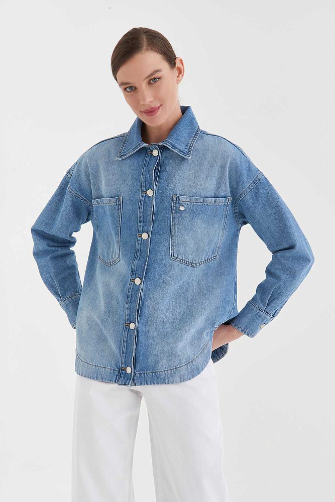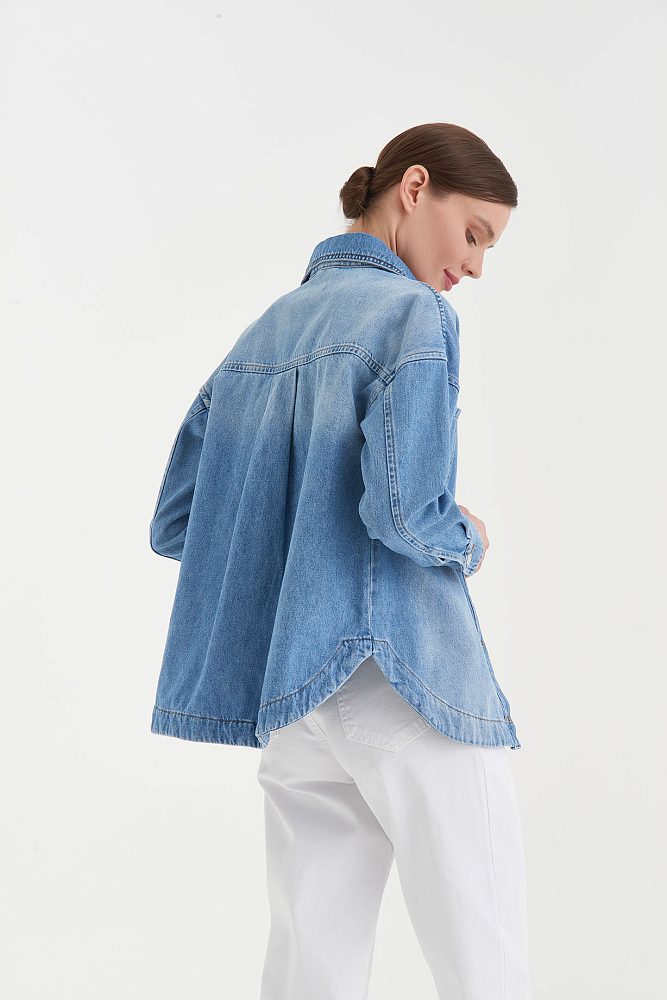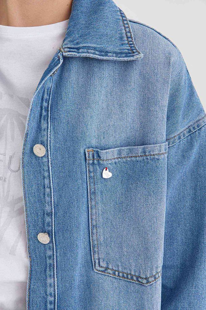 Джинсовая рубашка свободного кроя со спущенной линией плеча и металлическими пуговицами. Большие накладные карманы, асимметричная линия низа, акцентная деталь-сердечко — модель достаточно яркая, чтобы носить ее в застегнутом виде с базовым монохромным низом, и достаточно универсальная для составления сложных многослойных аутфитов.