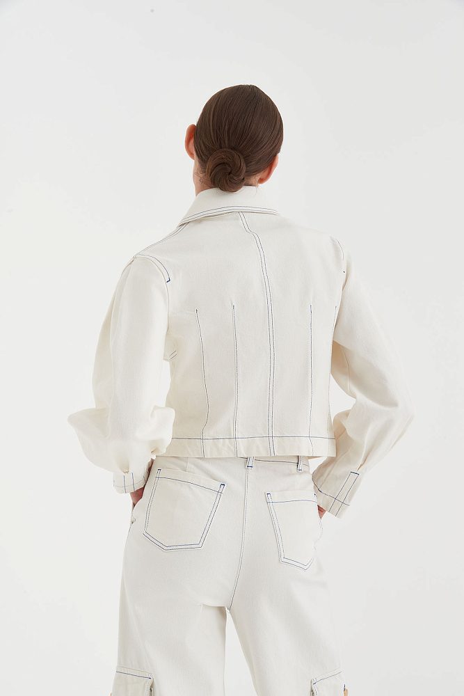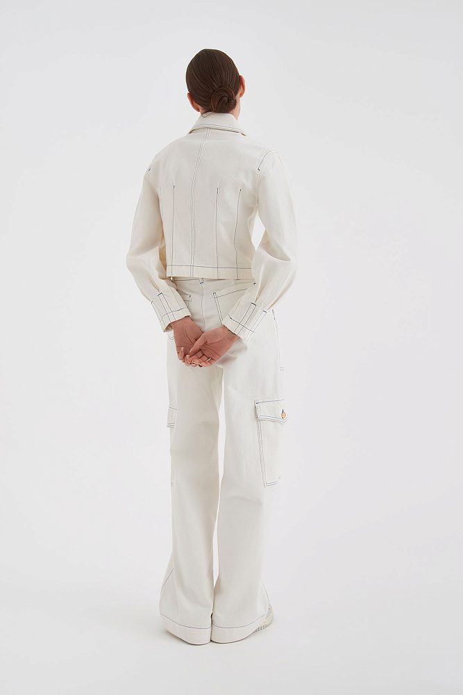 На создание этого жакета дизайнеров вдохновил самый женственный предмет гардероба – корсет. Контраст утонченных корсетных линий и слегка грубоватой фактуры ткани делает эту модель особенно притягательной. Жакет прекрасно сочетается с любыми брюками, юбкой или джинсами карго из той же коллекции ,  а также станет отличной базой для многослойного образа с пальто или плащом.