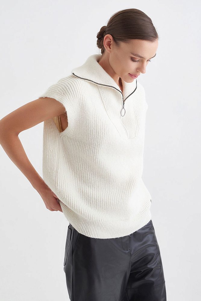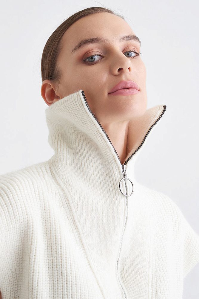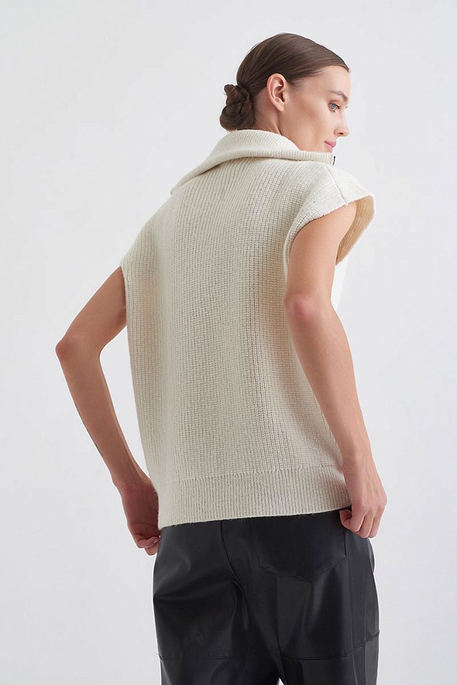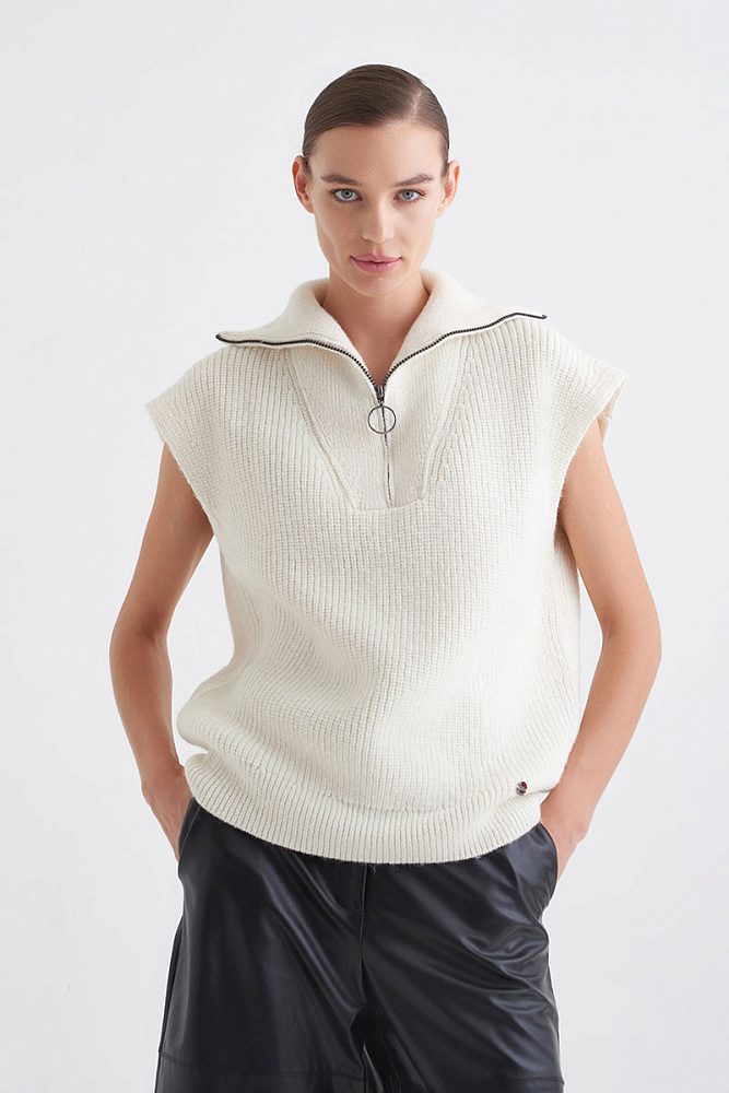 Объемный жилет в рубчик с добавлением нежнейшей шерсти альпаки — отличная альтернатива свитеру, которая благодаря своему натуральному составу позволит оставаться в тепле. Объемный воротник на молнии — заменит шарф. Кроме того, с жилетом легко придумать десятки многослойных комбинаций: с футболками, блузками, белоснежными рубашками и красивыми платьями.